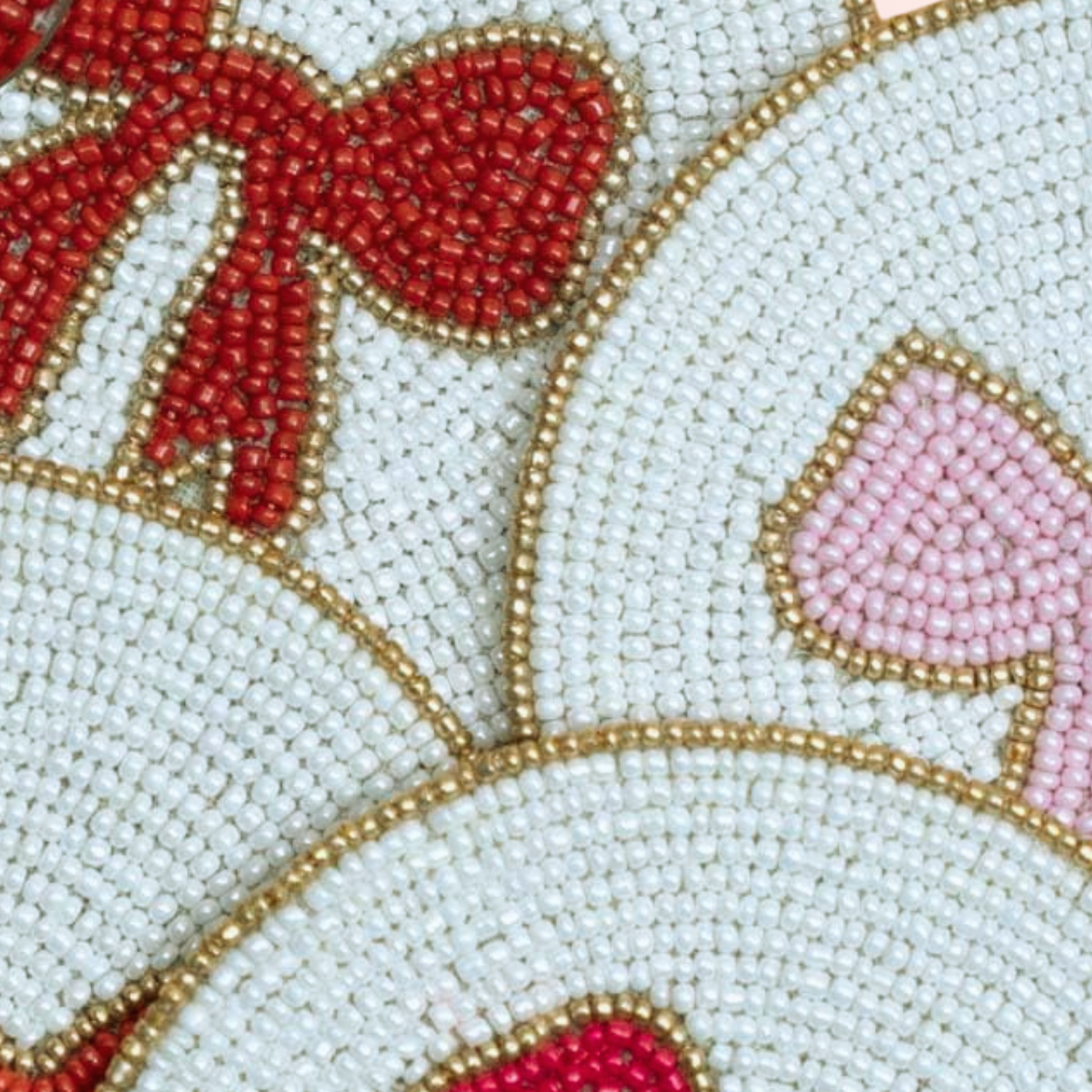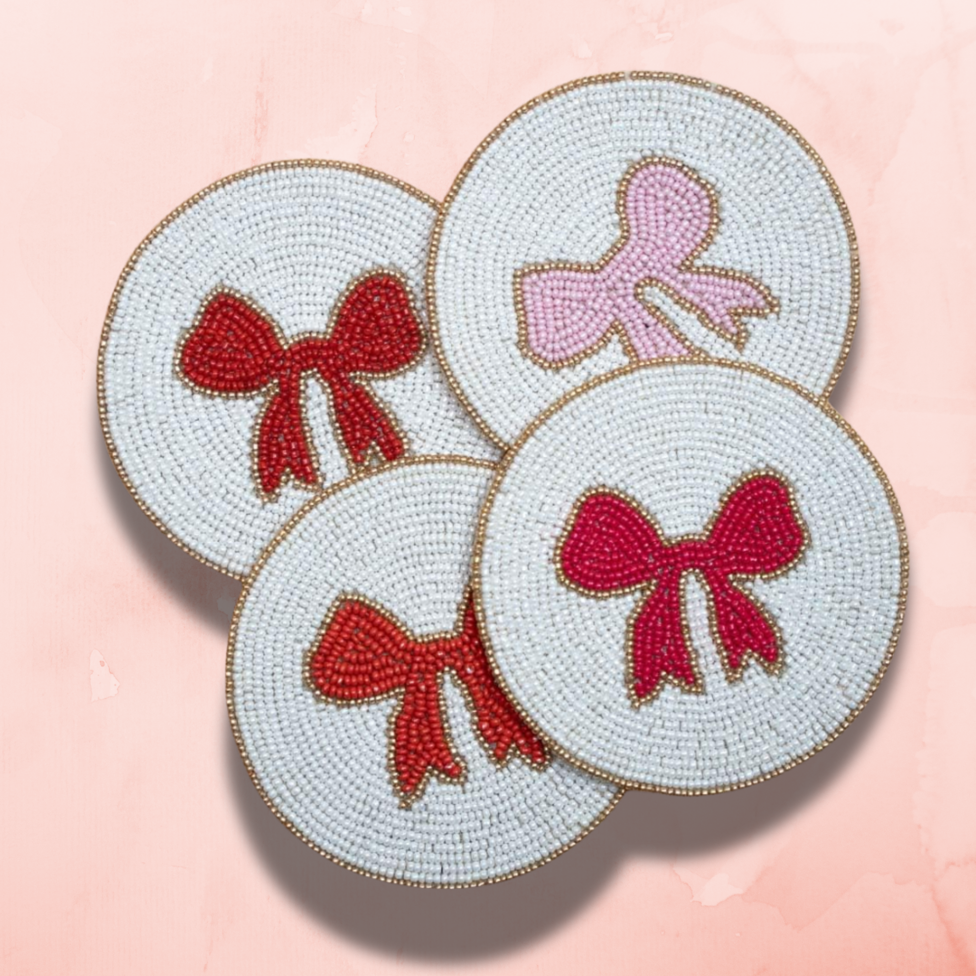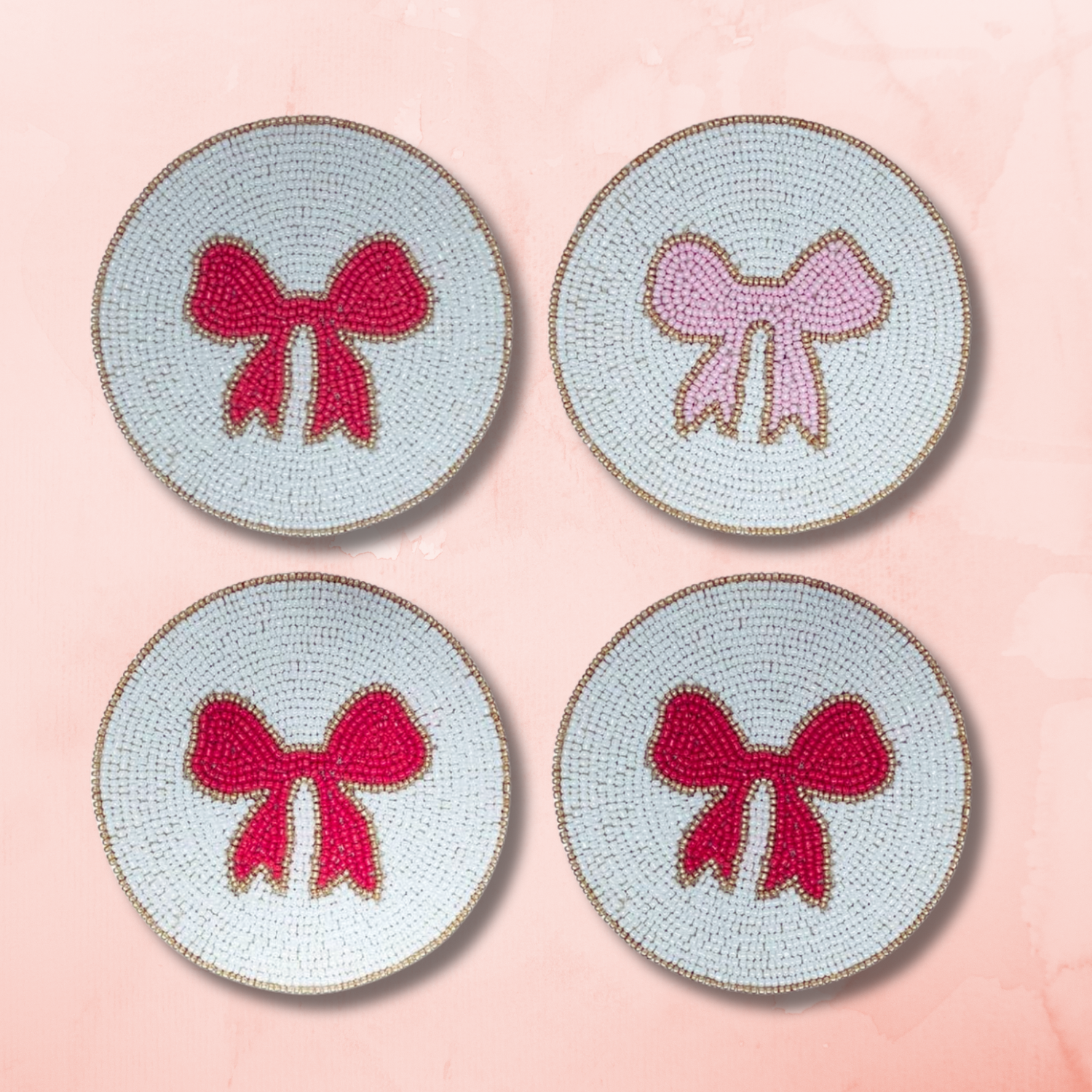 These beaded coasters are handcrafted and add a touch of coquette style to your tableware. The coasters feature a super cute pink bow design in a 4-inch standard design. The beading is intricate and catches the light.
