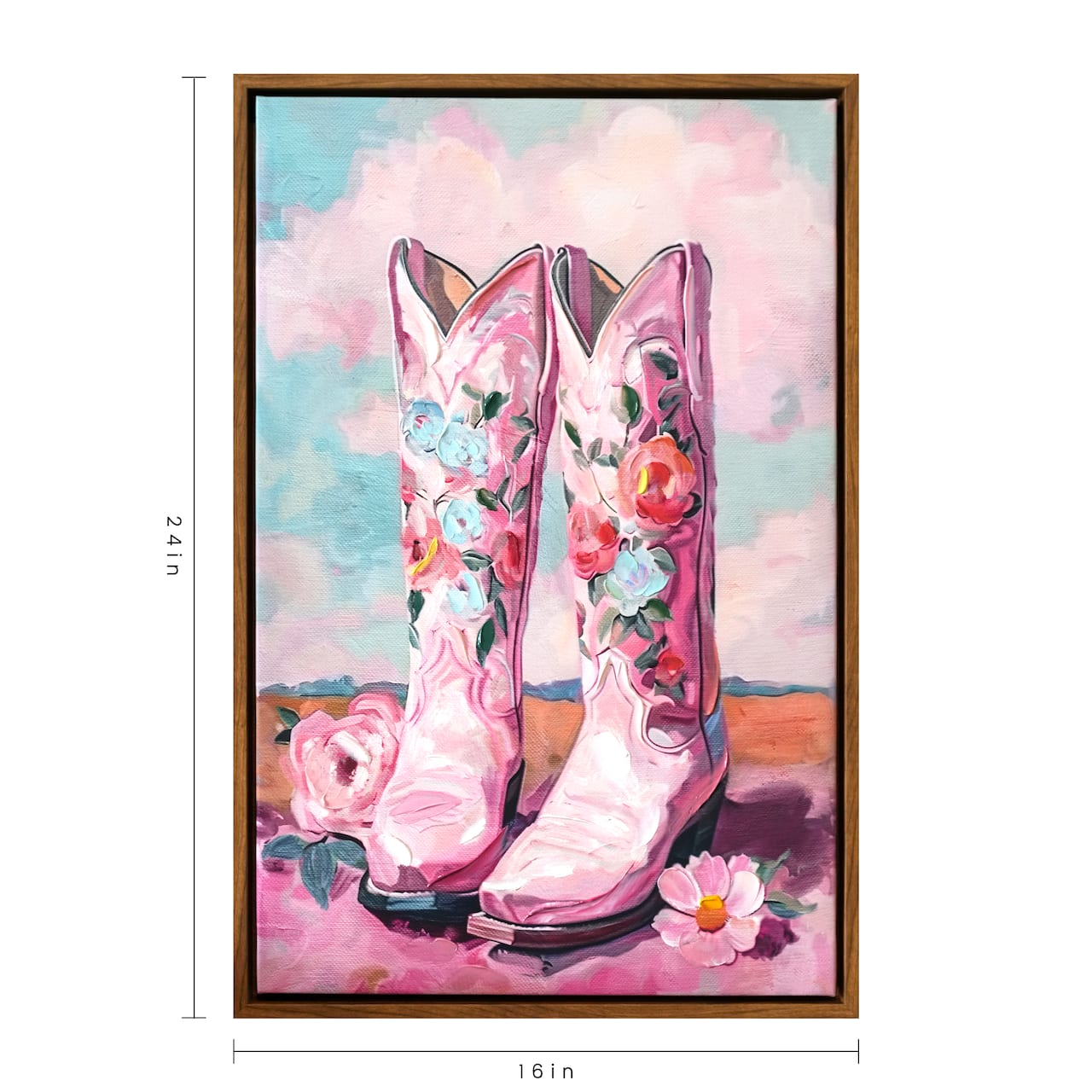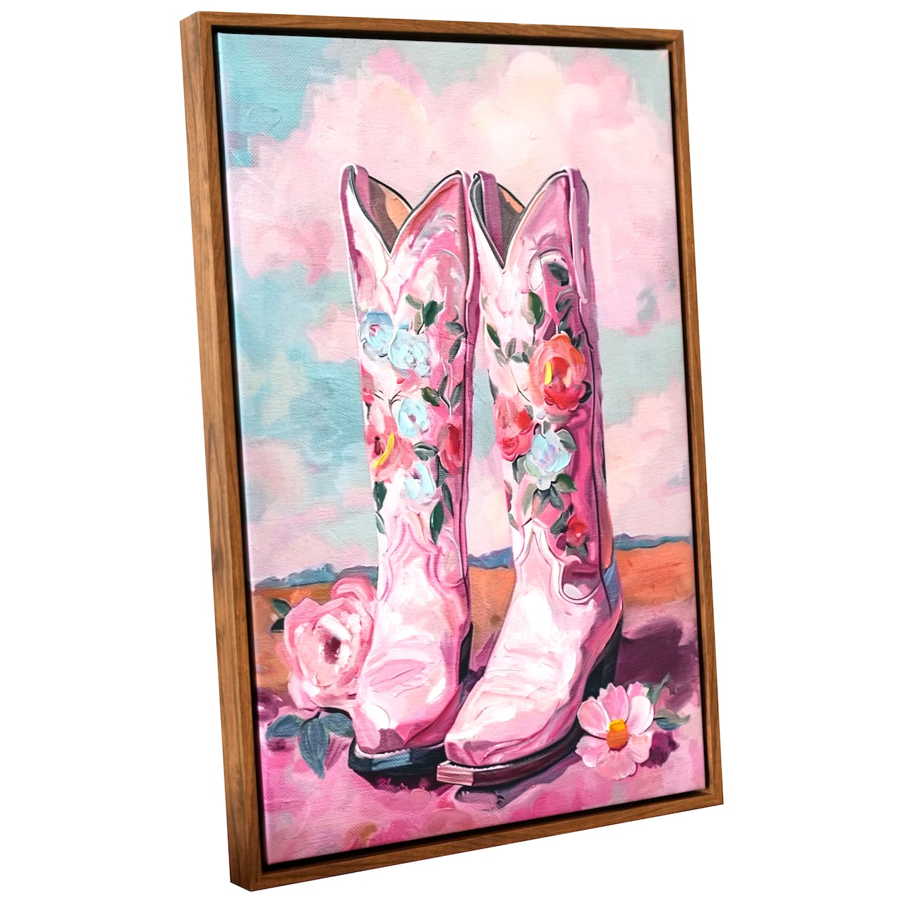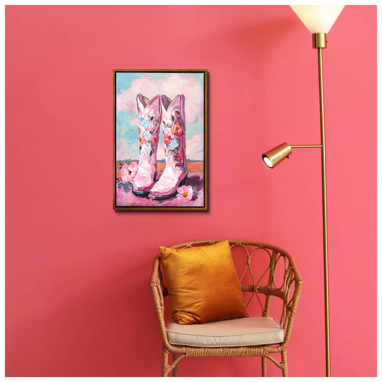 Add a bright, colorful glow to your living space with this wall décor featuring a fancy pair of boots with floral accents.
