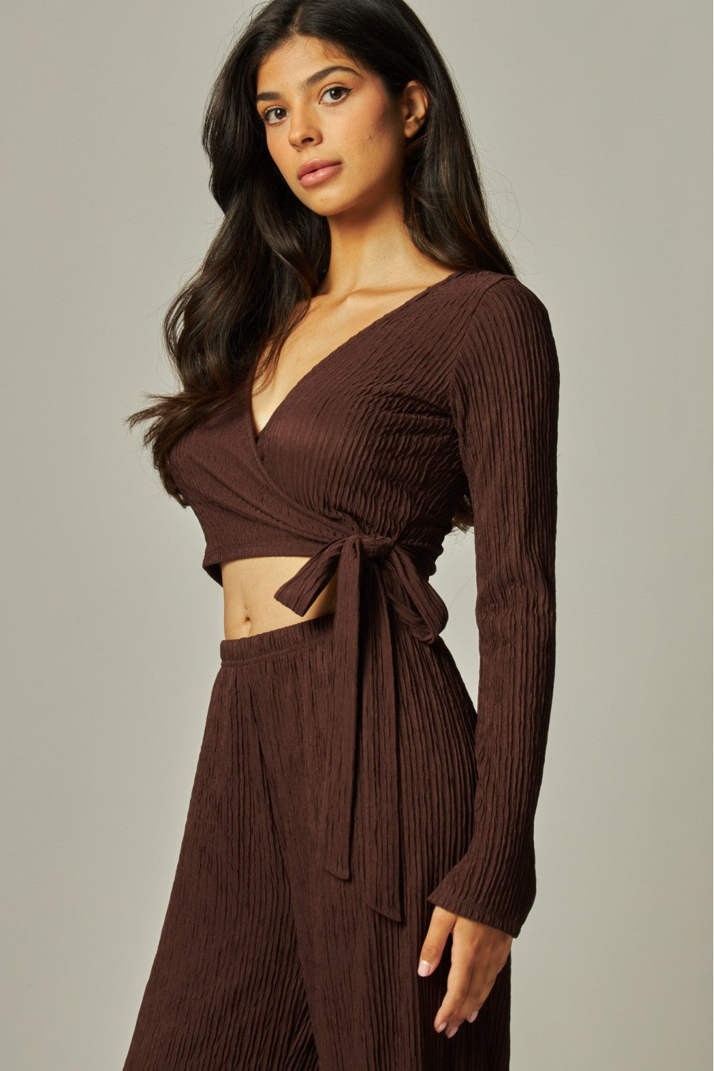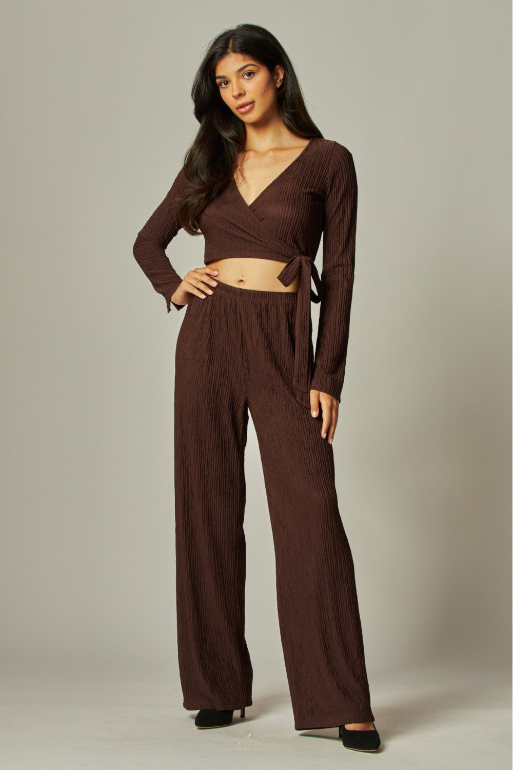 Meet the set that does not blend in. The ‘Plissed’ To Meet You Leisure Set takes the luxe crinkled plissé texture and turns it into a confidently effortless two-piece look. The cropped wrap top ties at the waist with satin-soft ribbons, while the matching wide-leg pants float with a relaxed drape. This is the outfit you wear when you want to look styled without trying, comfortable without slouching, and unmistakably you.