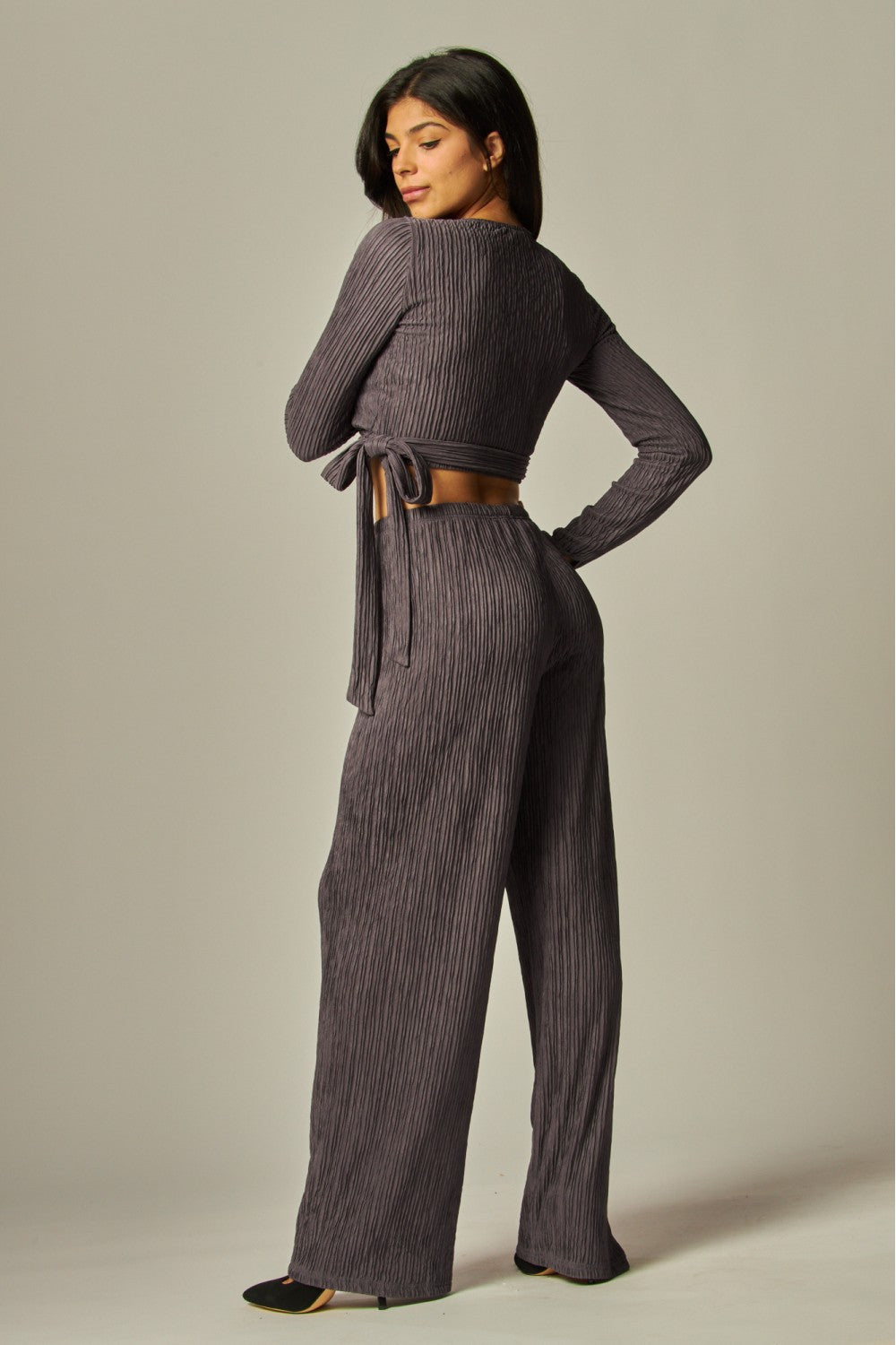 Meet the set that does not blend in. The ‘Plissed’ To Meet You Leisure Set takes the luxe crinkled plissé texture and turns it into a confidently effortless two-piece look. The cropped wrap top ties at the waist with satin-soft ribbons, while the matching wide-leg pants float with a relaxed drape. This is the outfit you wear when you want to look styled without trying, comfortable without slouching, and unmistakably you.