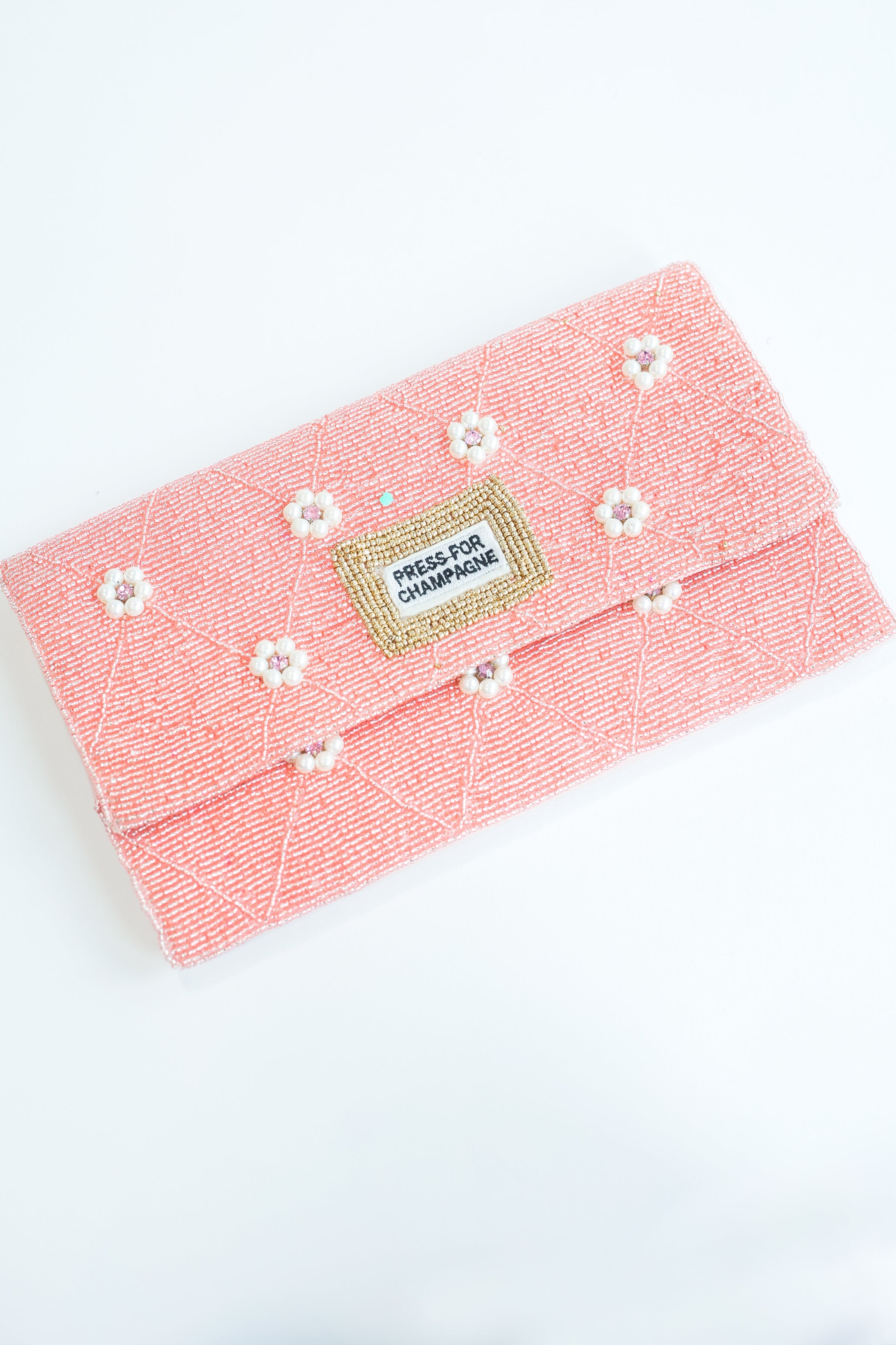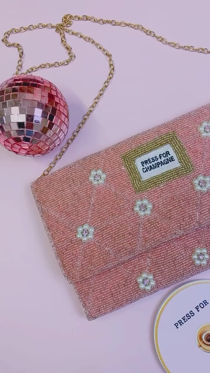 Add sparkle and celebration to your wardrobe with our PRESS FOR CHAMPAGNE Pink Pearl Beaded Crossbody Chain Clutch!