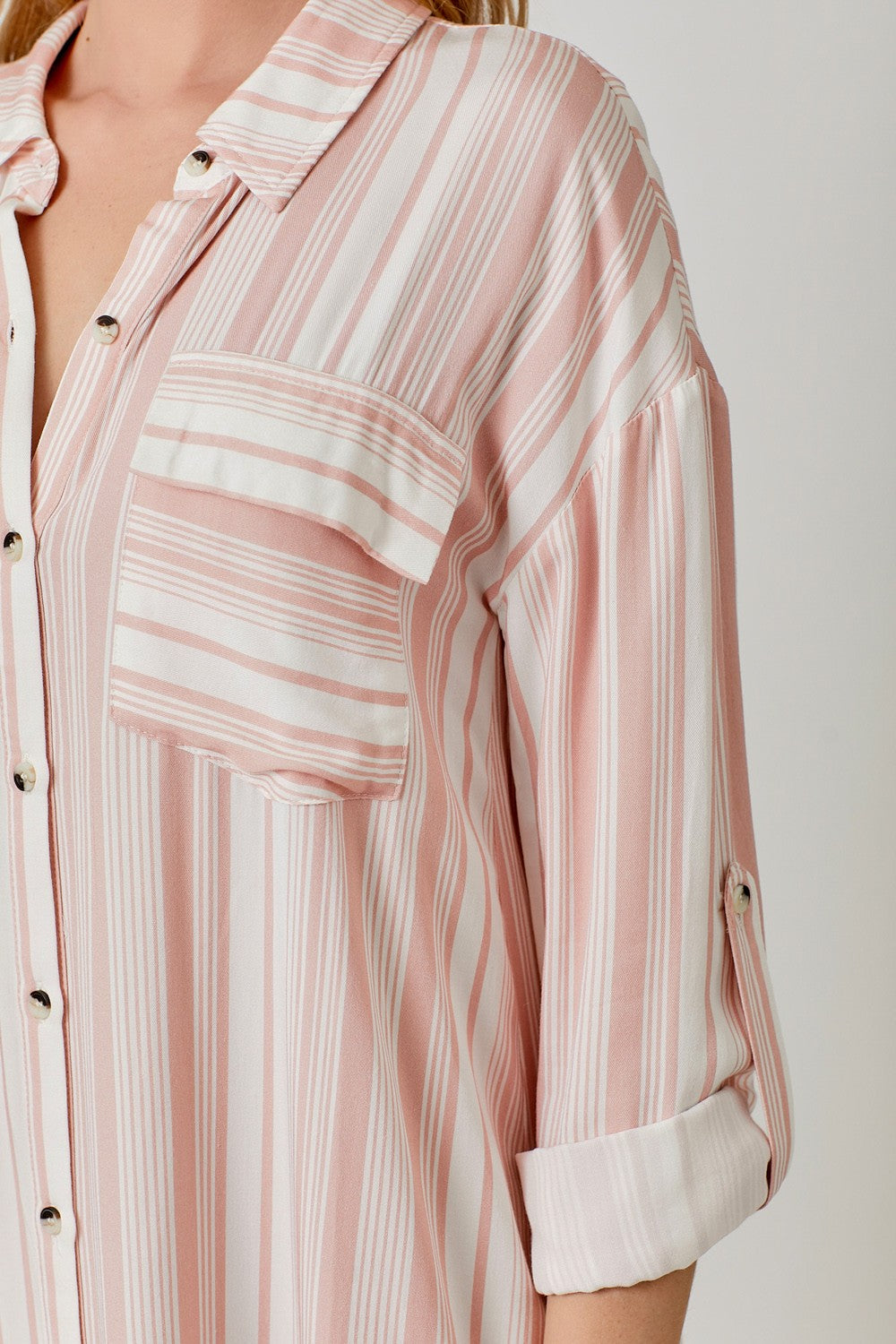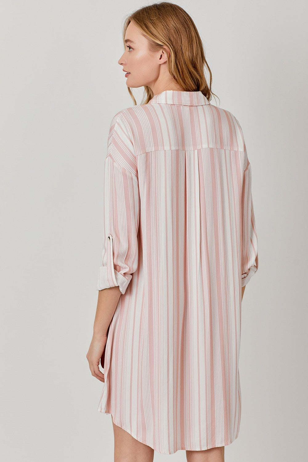 Stay chic and comfortable in this Pretty in Pink Striped Shirt Dress, crafted from lightweight 100% rayon. Featuring casual details and a relaxed fit, this versatile shirt dress is perfect for brunch dates, errands, or a laid-back day out.