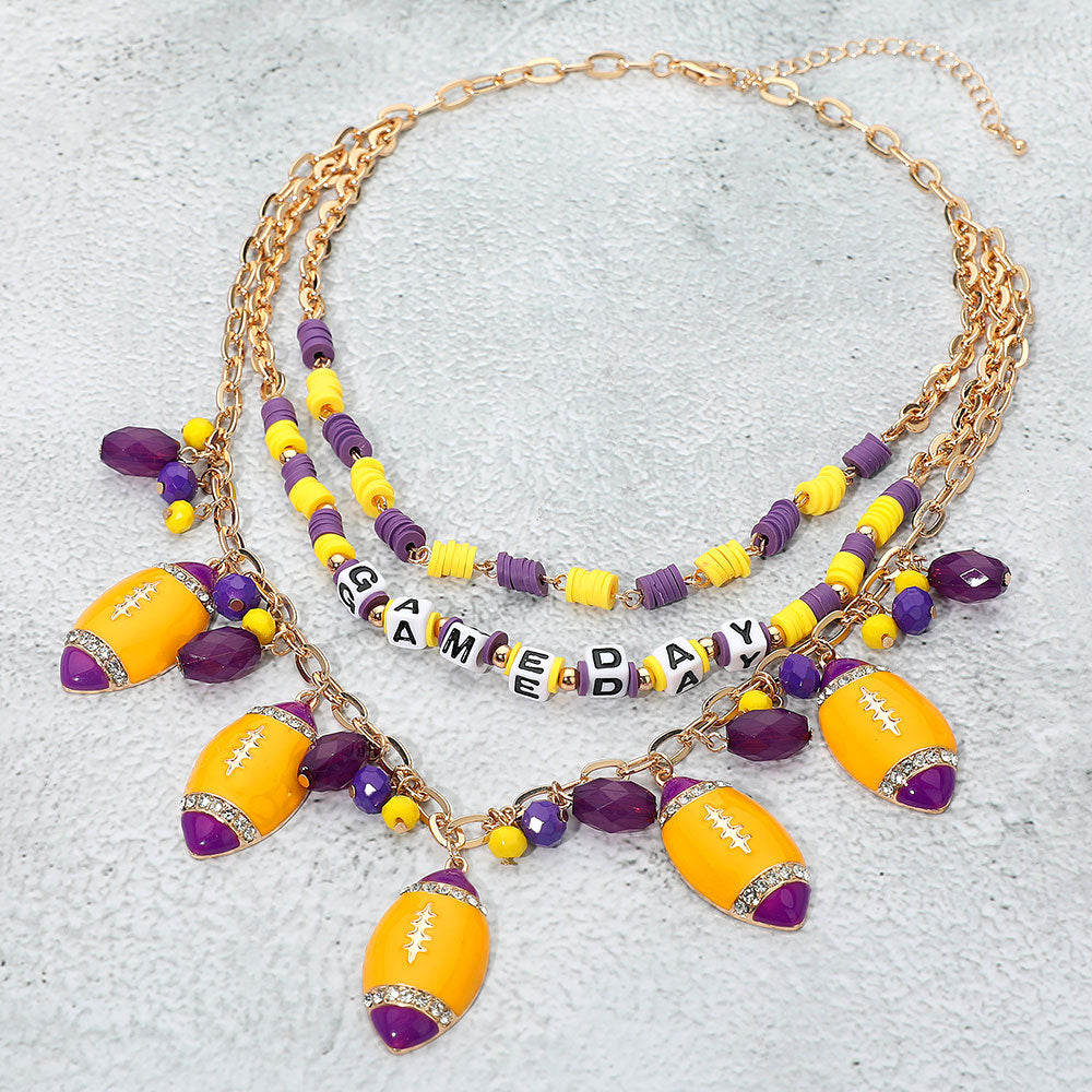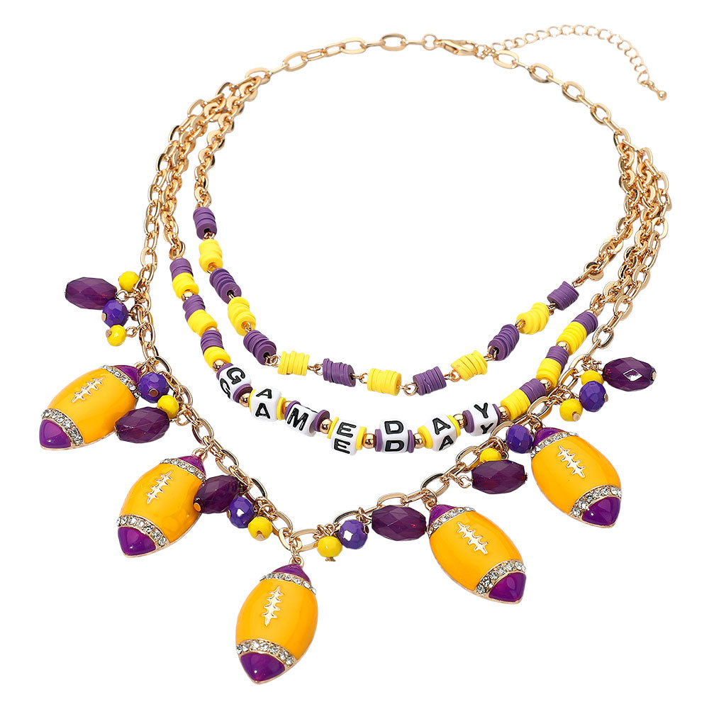 This layered gameday necklace blends purple and gold Heishi beads with football charms and “GAMEDAY” letter beads to energize any fan look. The playful, layered silhouette pairs perfectly with tees, jerseys, and tailgate-ready outfits.