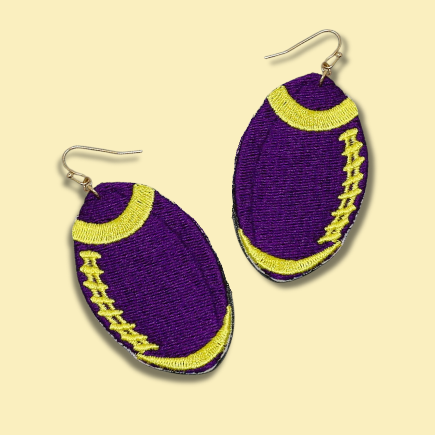 Show your pride with these embroidered football-shaped earrings in bold purple and yellow team colors. Designed to be featherlight on the ears with hypoallergenic hook fasteners, they add the perfect pop to tailgates, stadium days, and fan outfits.