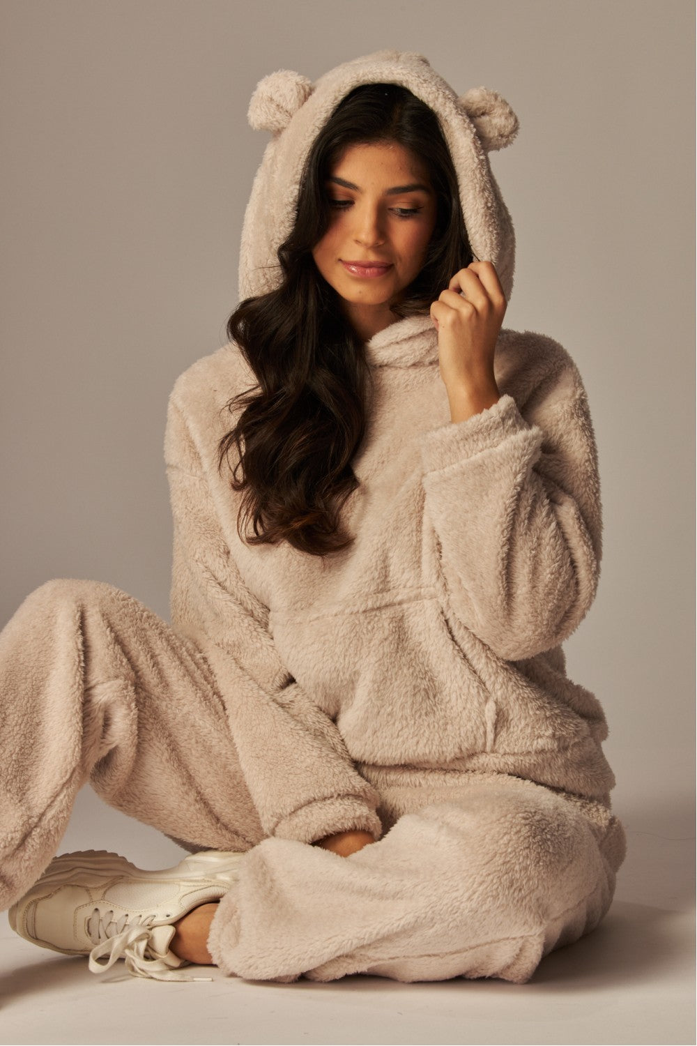 READY FOR TEDDY FLEECE HOODIE PAJAMA SET IN BEIGE