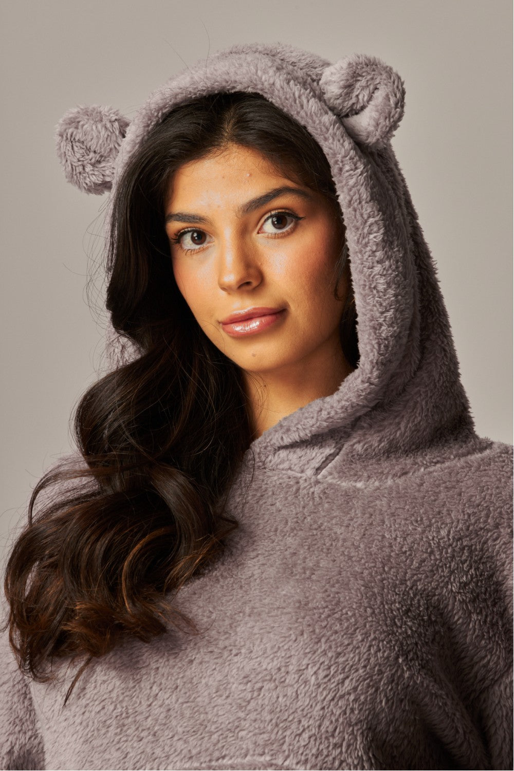 Sink into softness. This ultra-cozy pajama hoodie is made from brushed teddy fleece that wraps you in cloud-level warmth. Designed with a relaxed, boyfriend-inspired fit, it features easy drop sleeves, a roomy kangaroo pocket, and a playful bear-ear hood for charm without the childish vibe. Pair it with the coordinating pant for head-to-toe comfort that feels indulgent yet effortless.