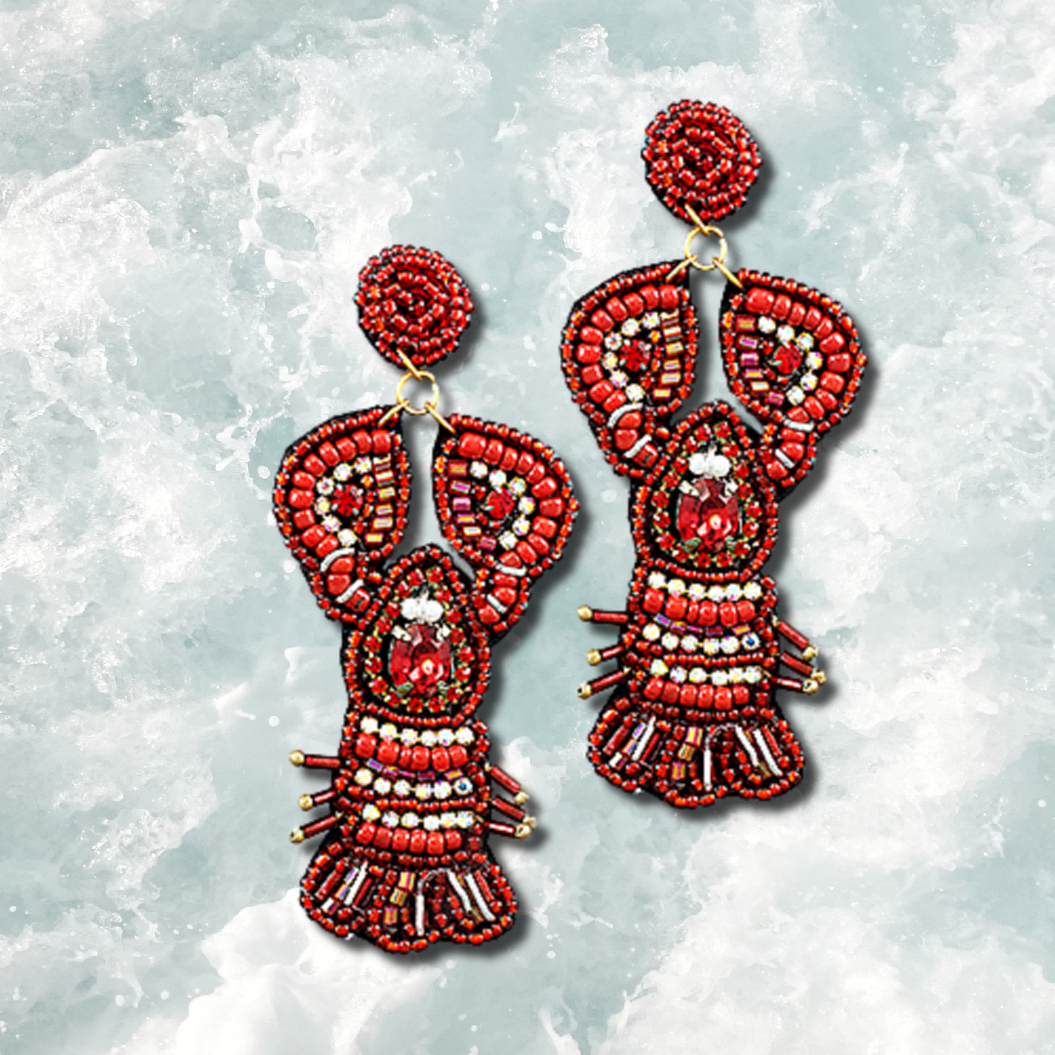 Red Jeweled Lobster Seed Beaded Rhinestone Earrings