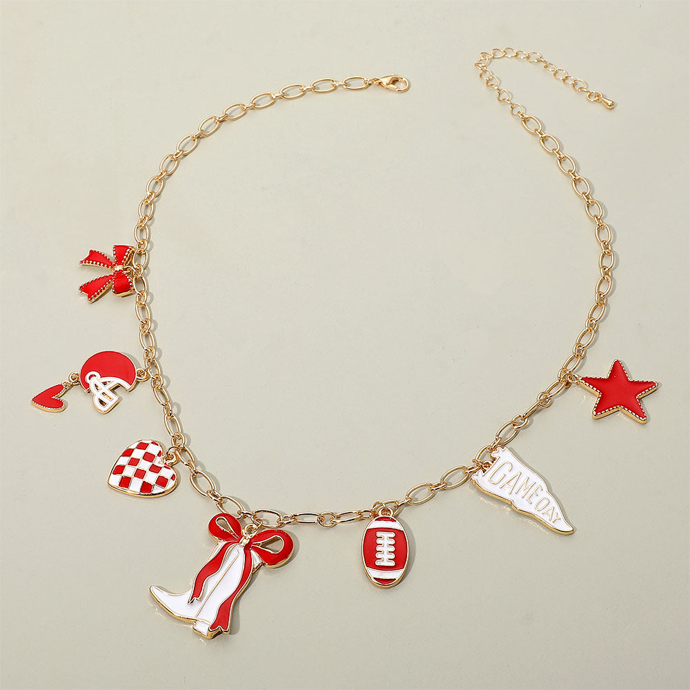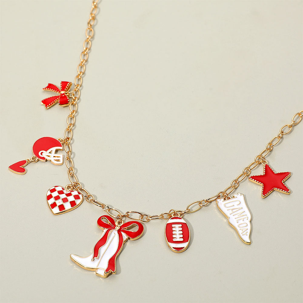 Celebrate your team pride with this Western-themed football charm necklace featuring playful enamel charms — including a football, cheer bow, helmet, heart, star, and boot. A spirited accessory to complete your outfit for sporting events, tailgates, and fan gatherings.