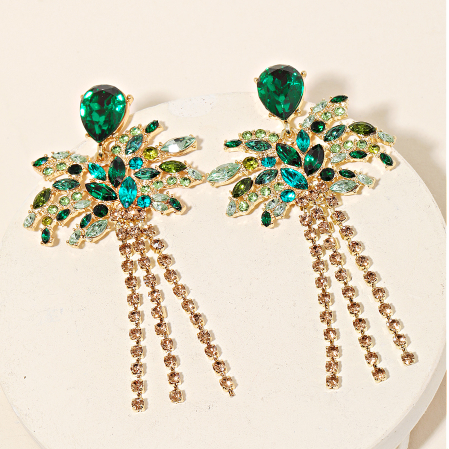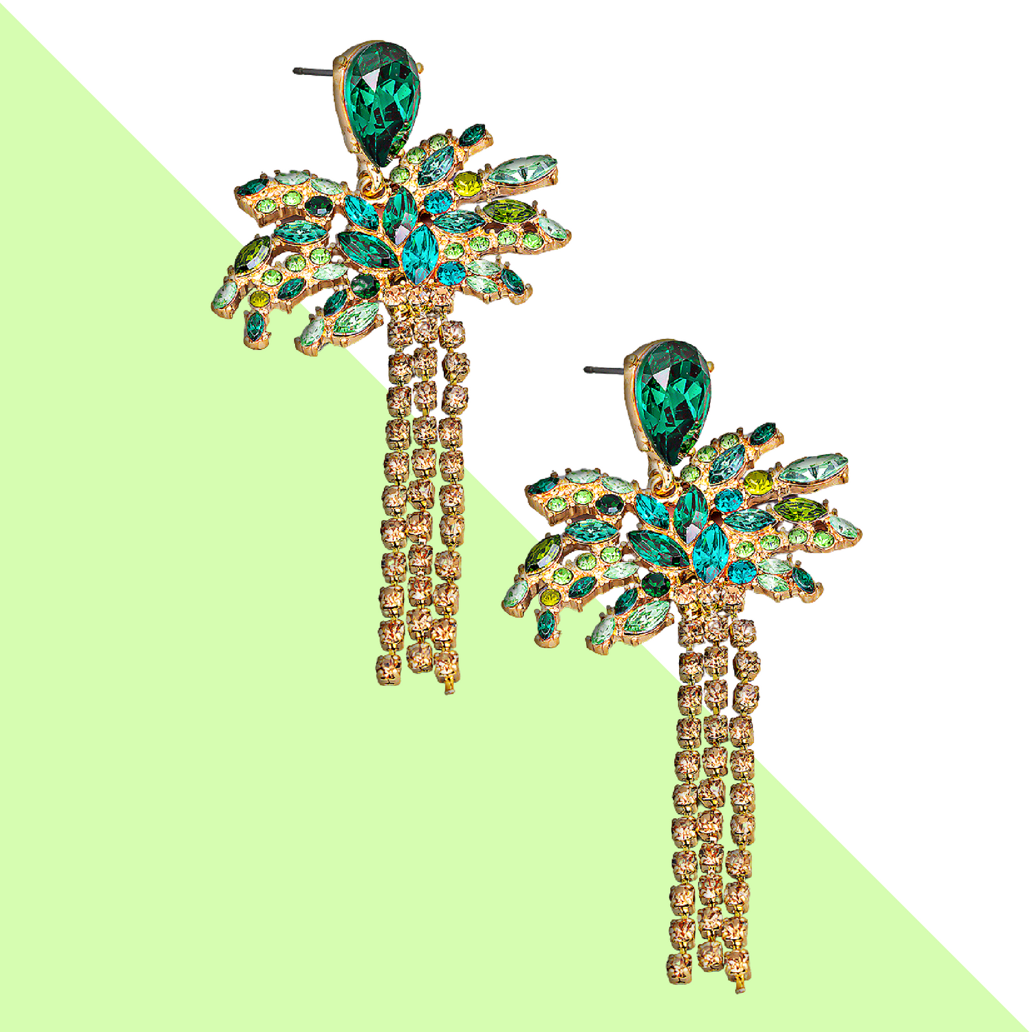 Rhinestone Crystal Fringe Resort Palm Tree Earrings