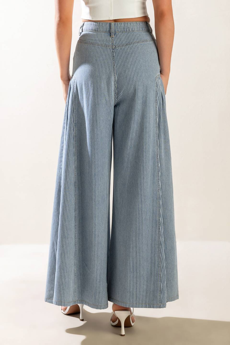 A striped washed high waisted denim pant featuring front closure, side pockets and extra wide leg.