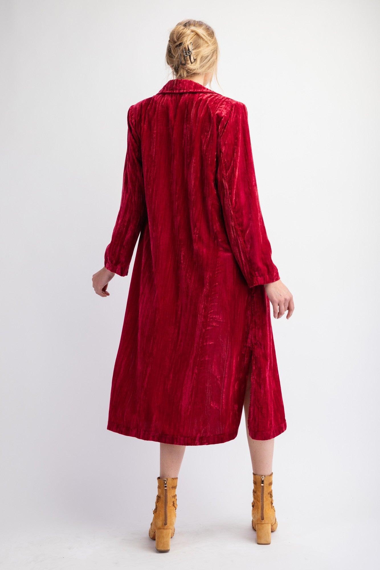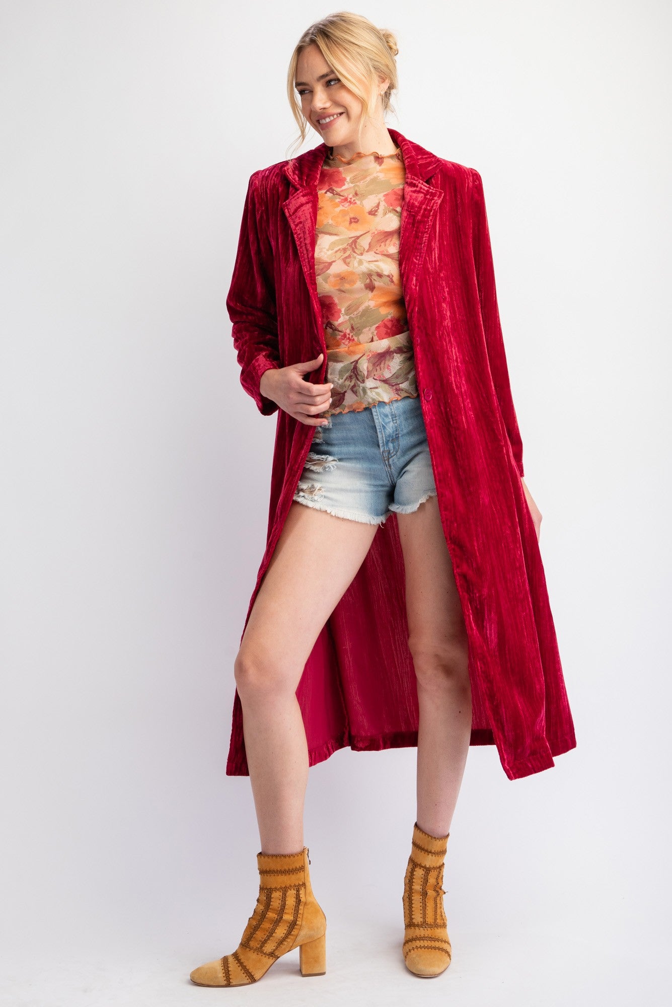 Say hello to comfort and style, the graceful and classy Velvet Sadie Coat features a longline silhouette, button front closure with side pockets, lapel collar, side slits and padded shoulders for a more flattering look.