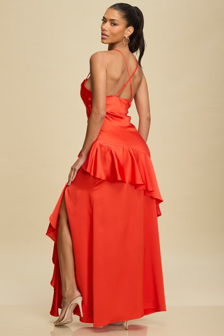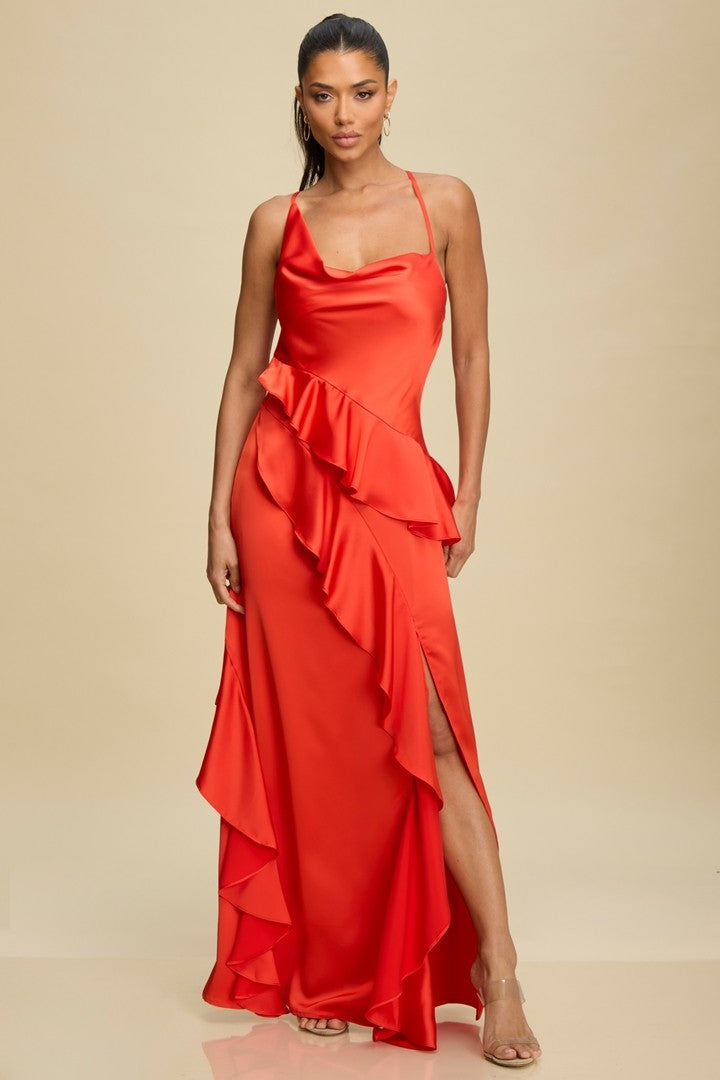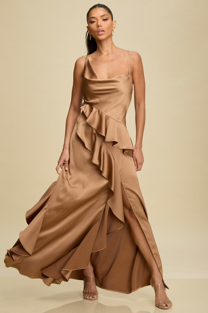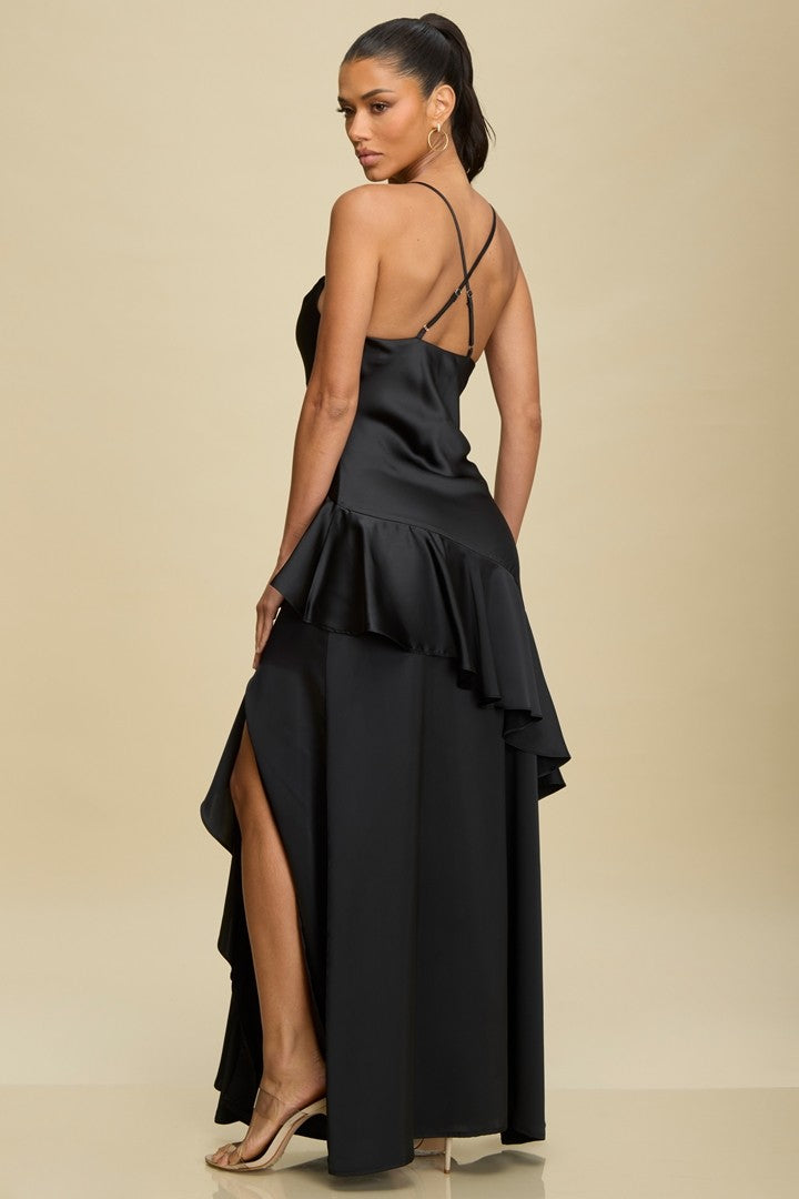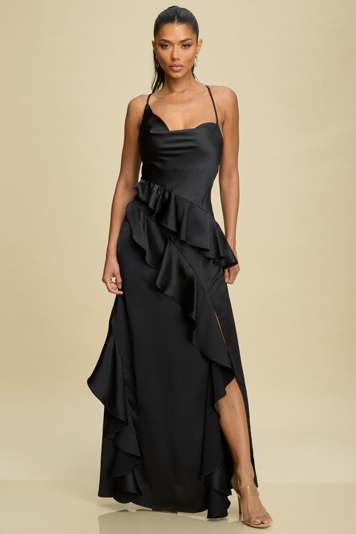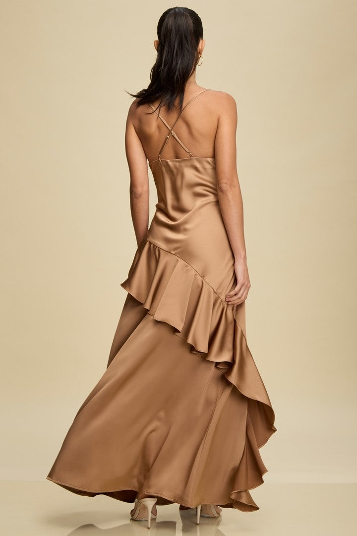 Satin maxi gown with cascading ruffle detail