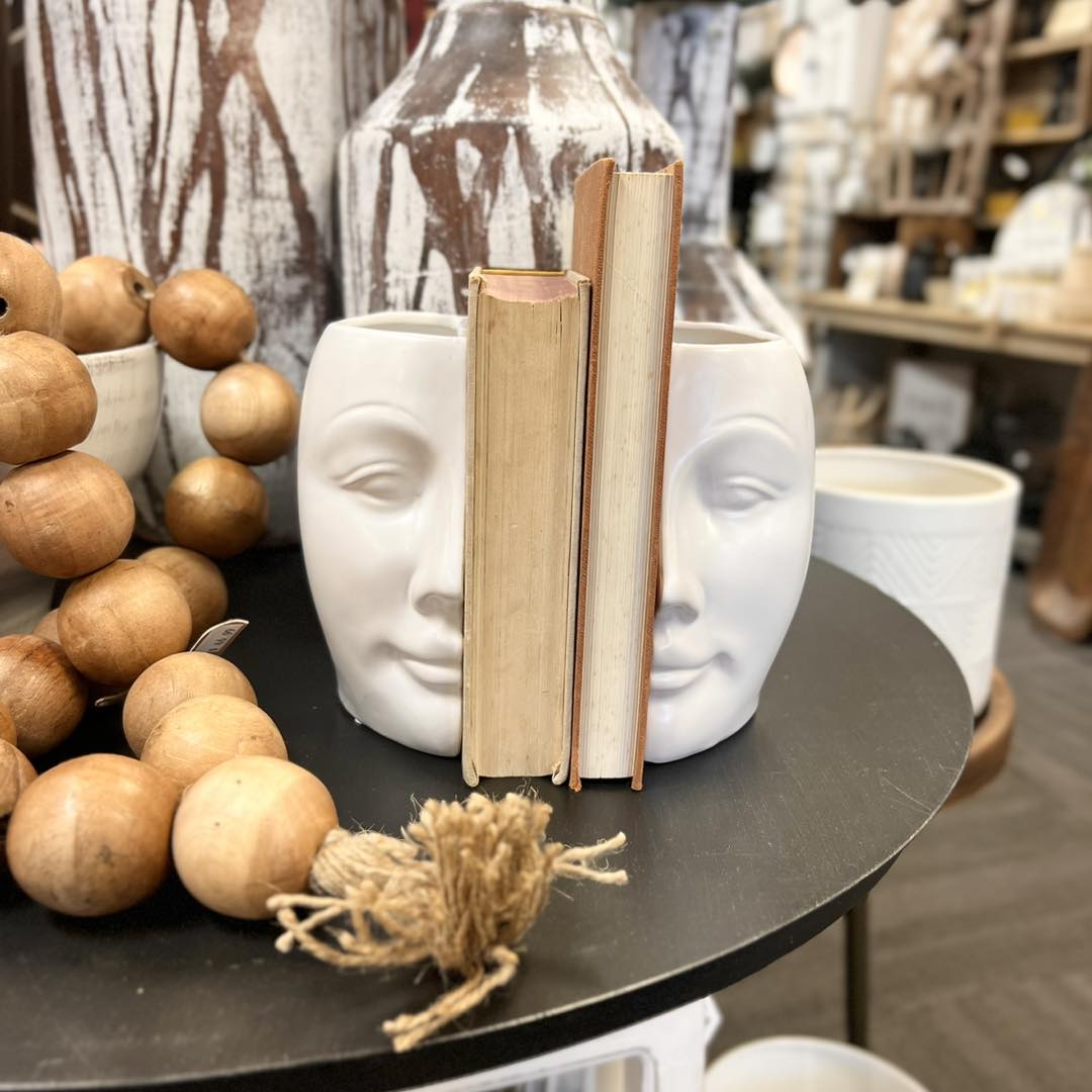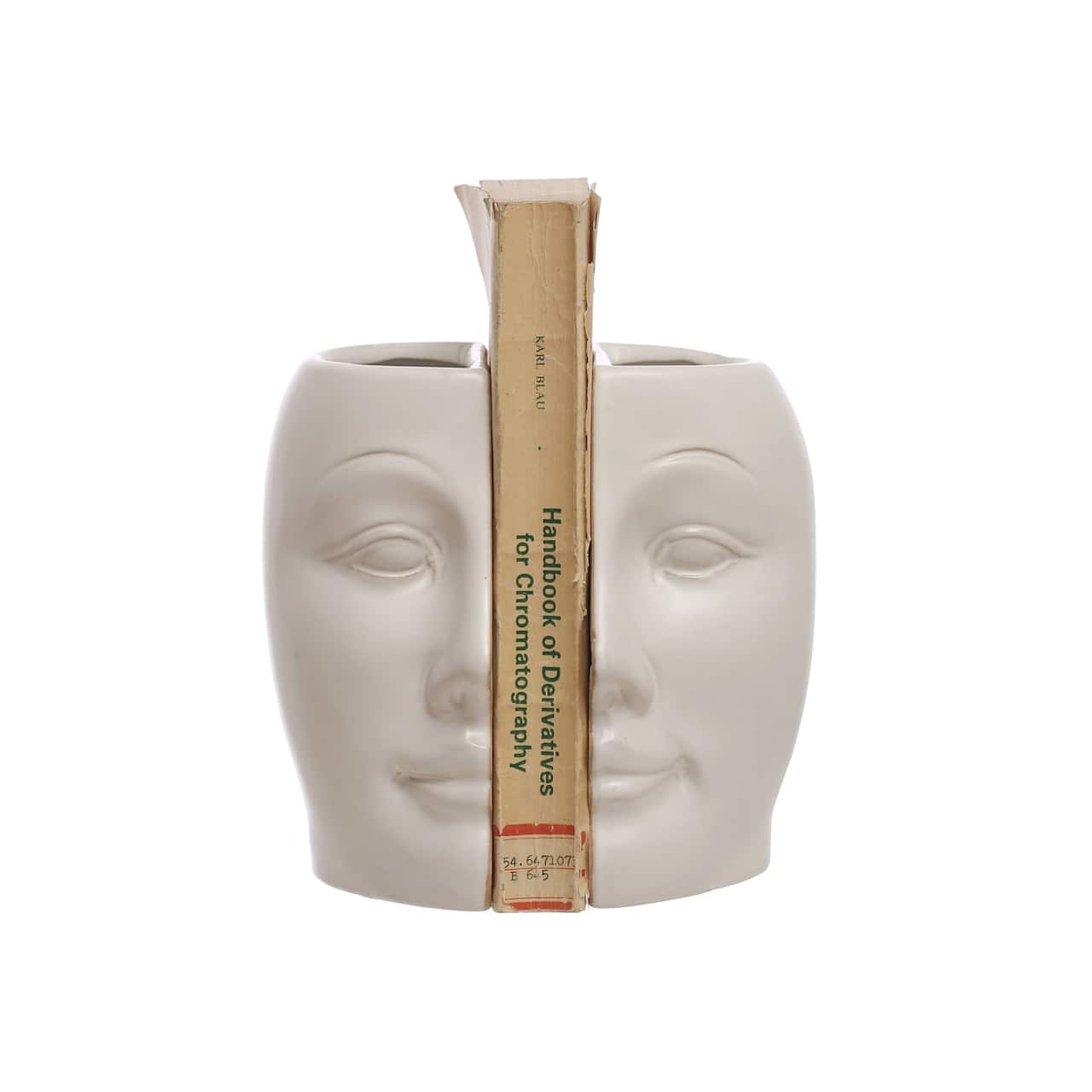 Crafted from high quality stoneware with a beautiful white reactive glaze that makes each item vary slightly in appearance and truly one-of-a-kind, this set of two vases/bookends showcases a unique sculpted design with a distinct face design that creates an artistic and eye-catching display.