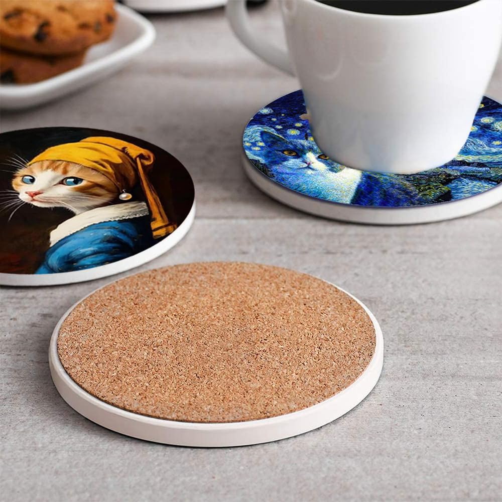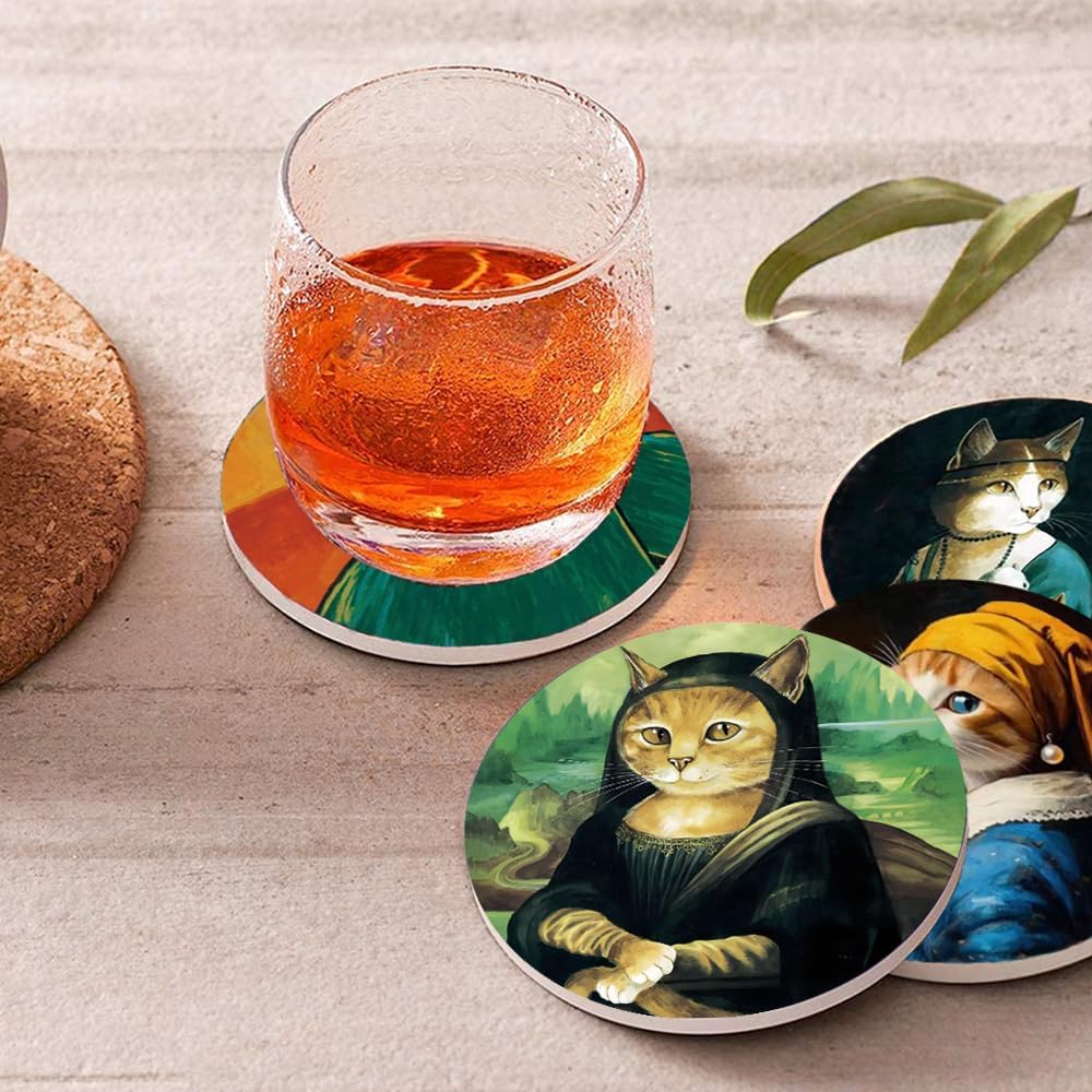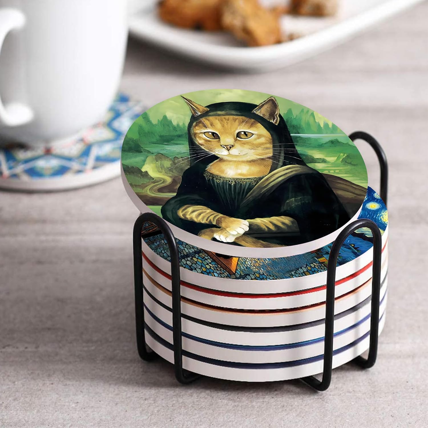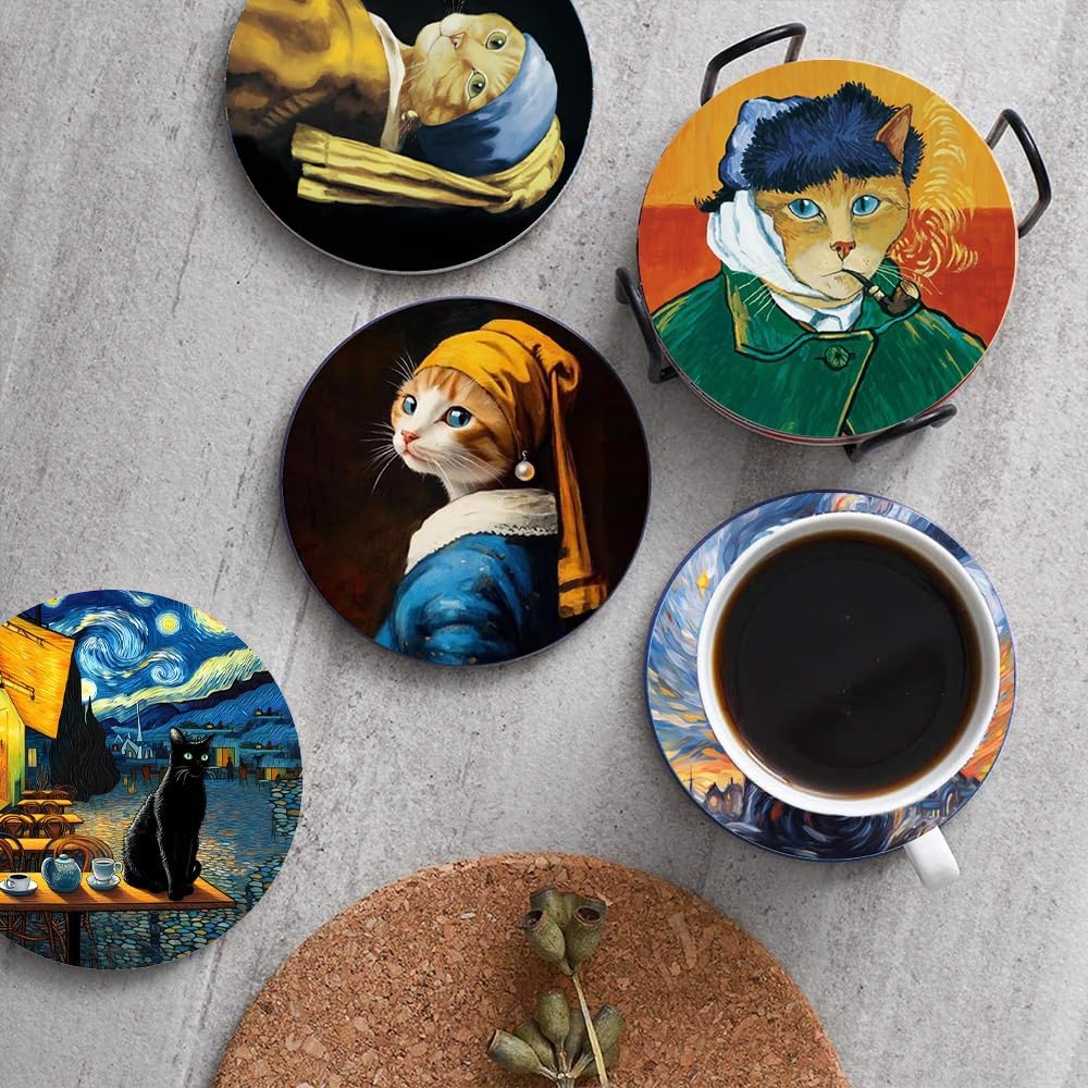 The coasters depict cat parodies of famous paintings by various artists, including Vincent van Gogh, Leonardo da Vinci, Johannes Vermeer, and Gustav Klimt. The artist who created these cat parodies is Susan Herbert.