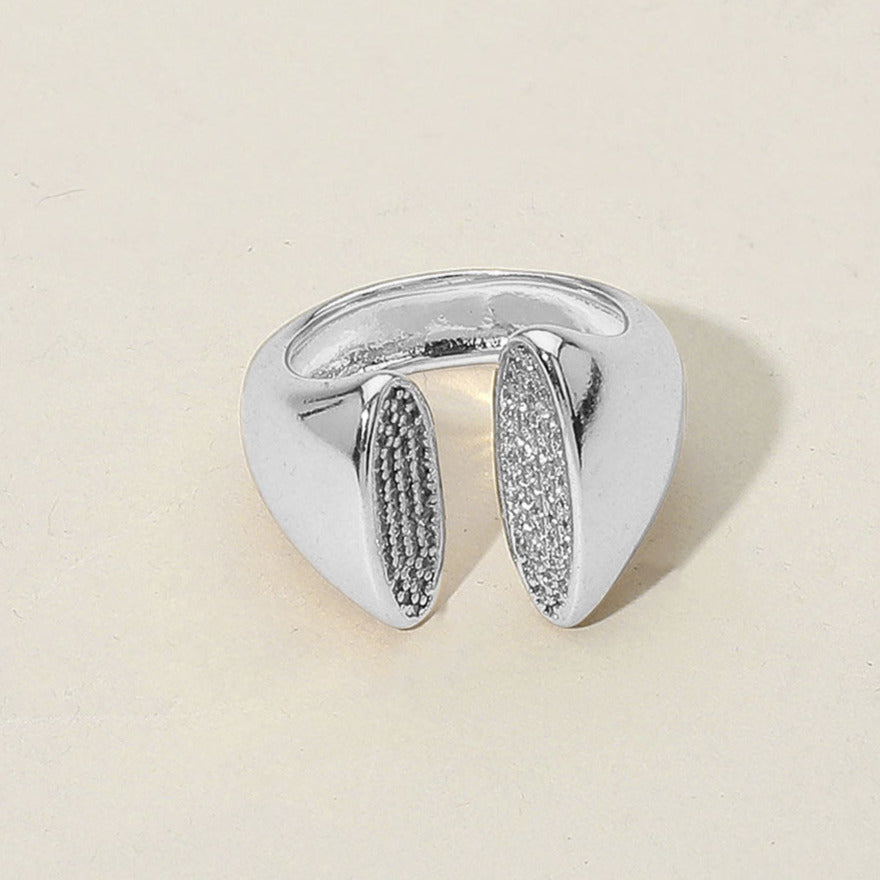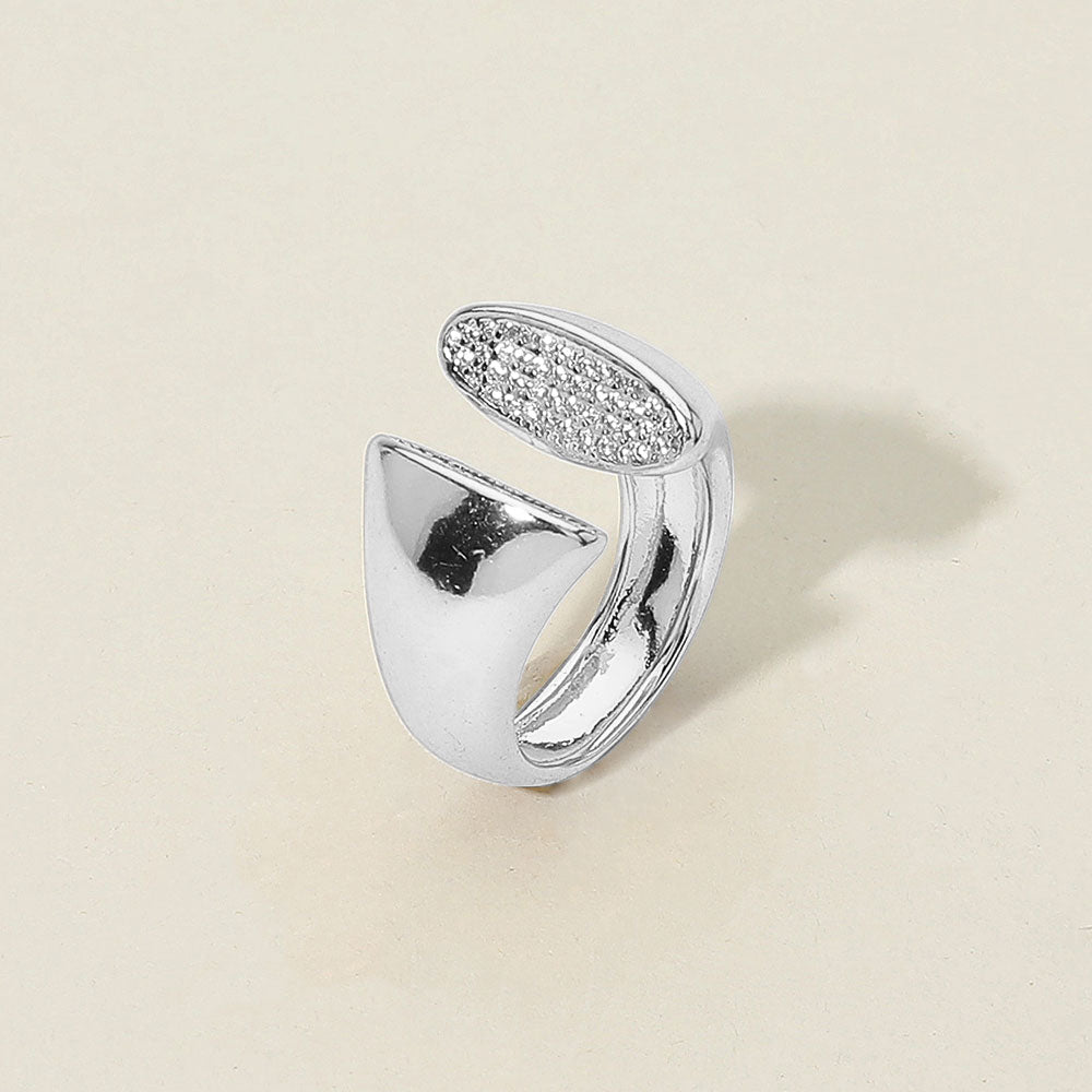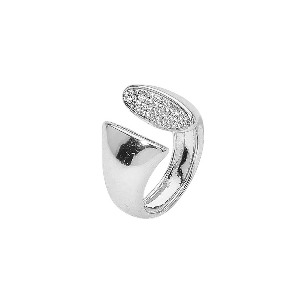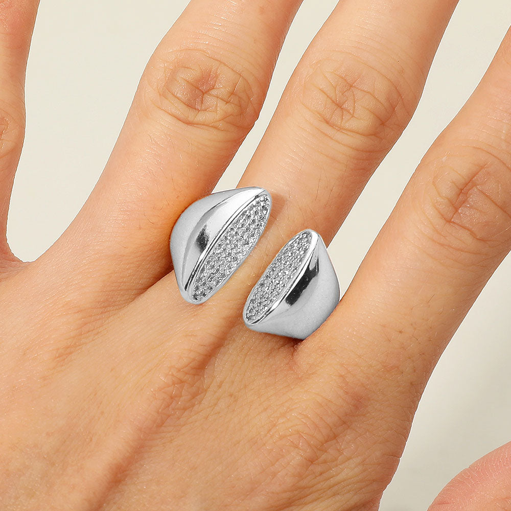 Make a modern statement with the Sideways Silver Crystal Statement Ring. Designed with a sleek open band and wide tapered shape, this contemporary piece features pavé detailing on one end for a refined touch of sparkle. Adjustable for the perfect fit, it’s crafted from high-quality brass and finished with genuine cubic zirconia for timeless shine and sophistication.