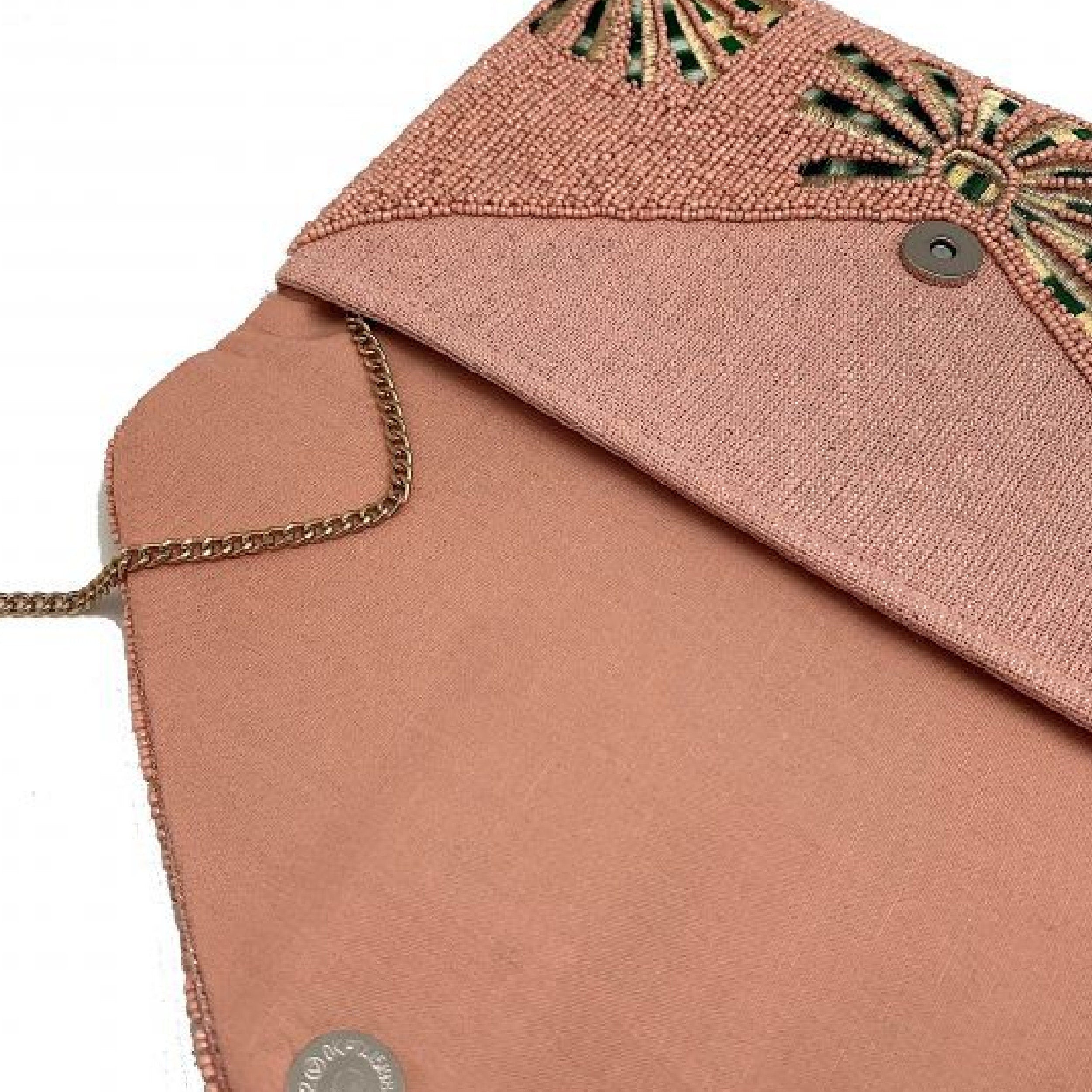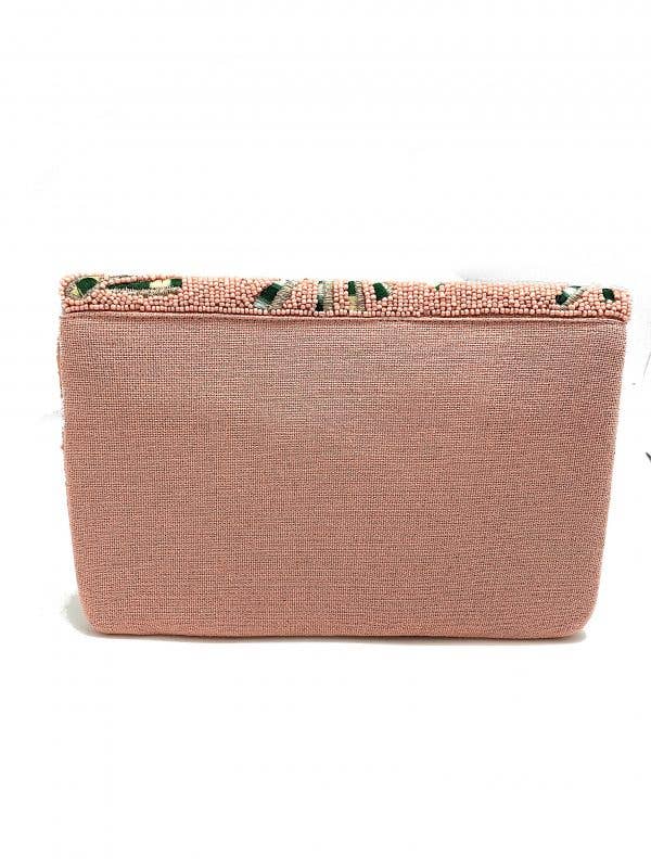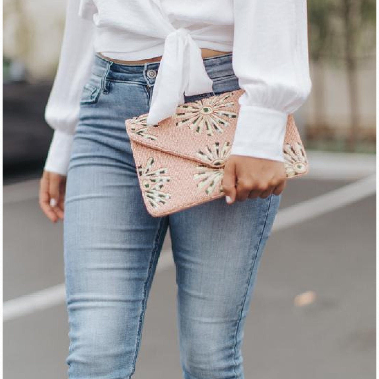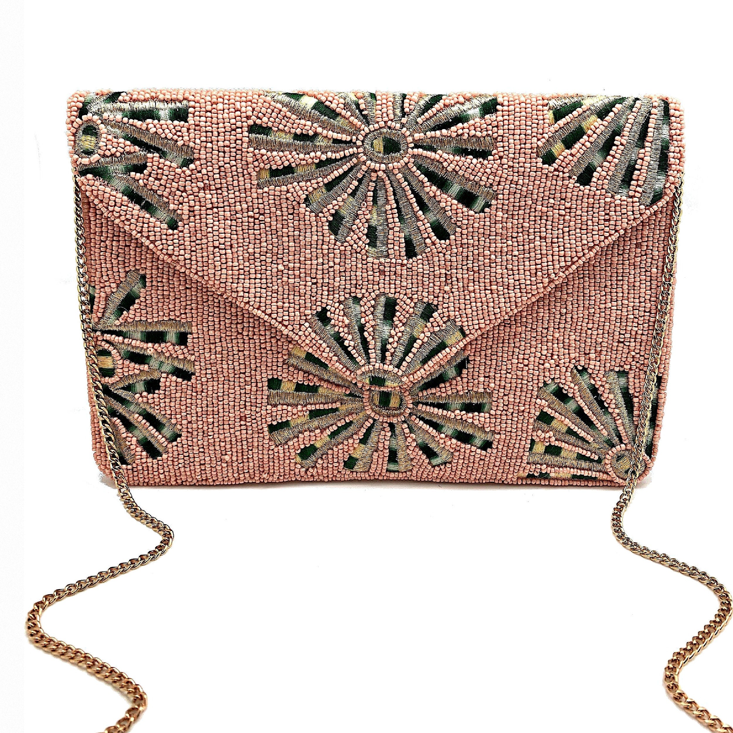 Add sparkle and a pop of flamingo pink to your wardrobe with our Sienna Starburst Seed Bead Crossbody Chain Clutch Boho Handbag!