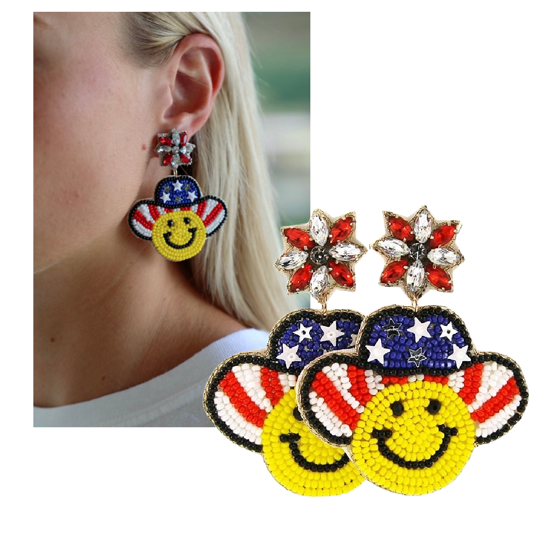 Smiley Face Emoji Flag Patriotic Cowgirl Beaded Earrings