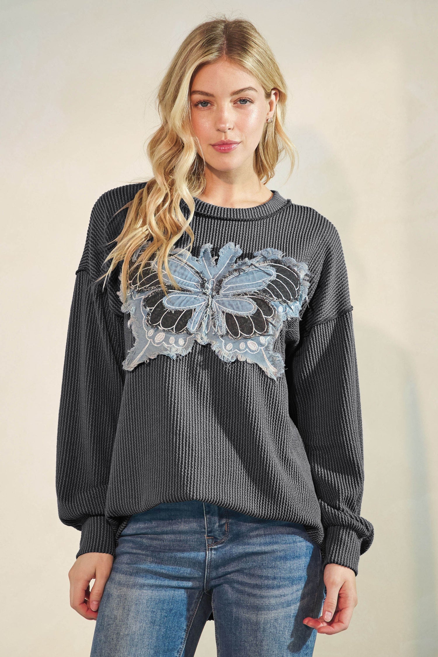 #socialbutterfly #butterflytop #thermalrib #puffysleeves #whimsicalstyle #casualchic #layeringtop #cozychic #denimpatch #playfullayers