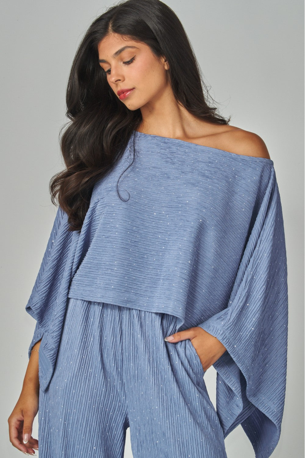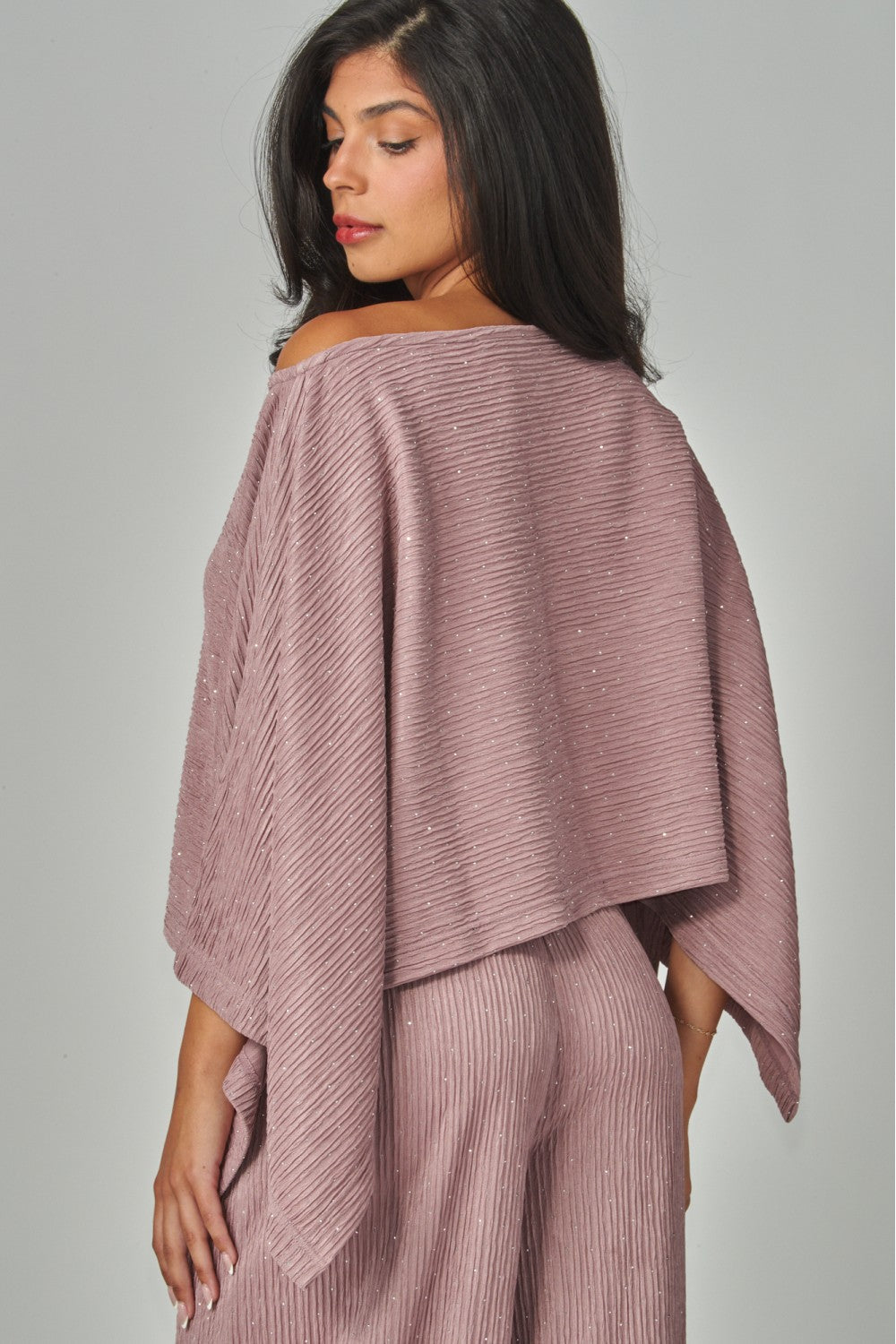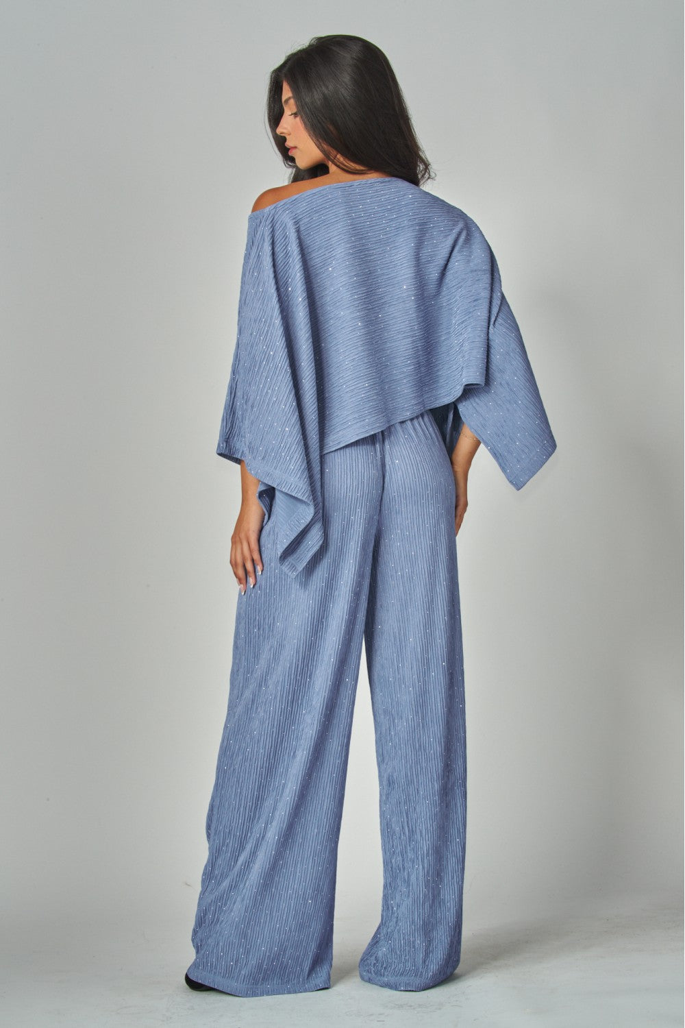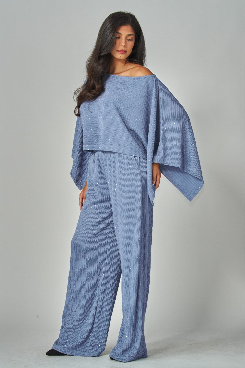 The cape-style kimono top drapes beautifully with its round neckline and wide long sleeves, flowing effortlessly over the frame. Paired with matching wide-leg pants, the ensemble blends comfort, movement, and elevated presence.