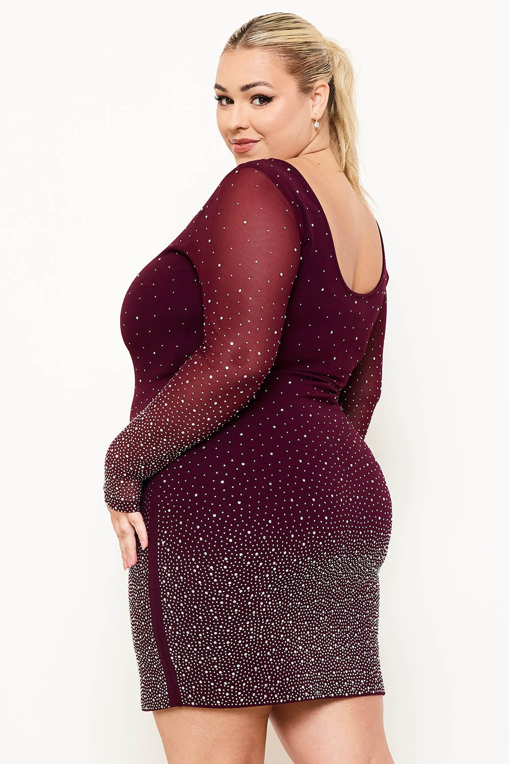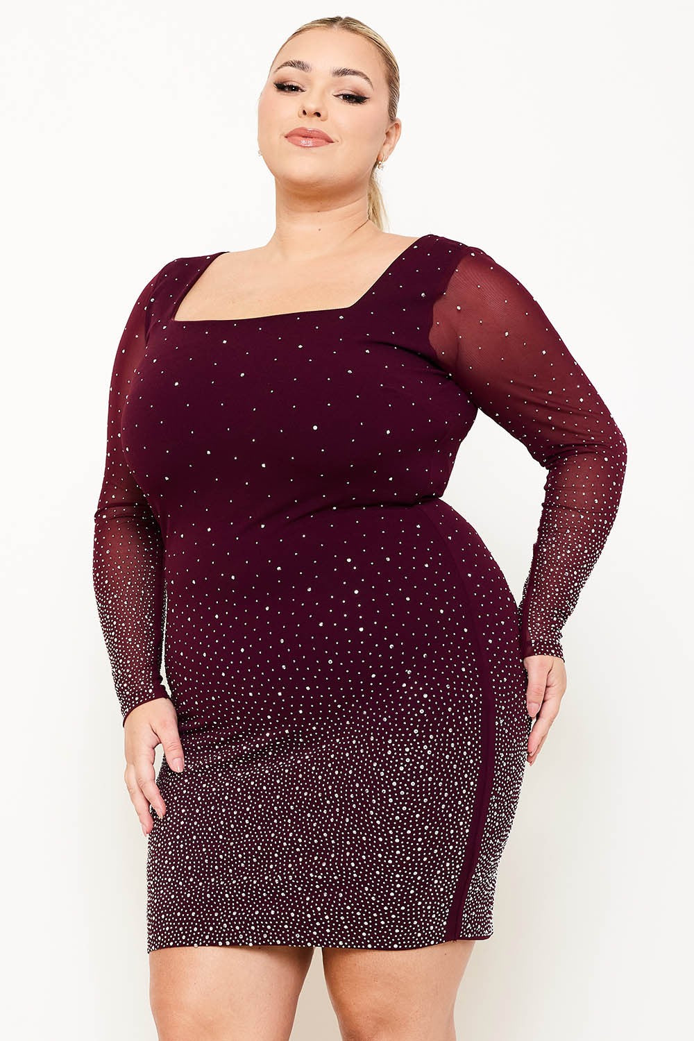 Shine like the night sky in the Starry Skies Rhinestone Sparkle Dress, a curve-loving plus-size mini that blends sultry design with celestial sparkle. Featuring a square neckline, sheer mesh long sleeves, and a dramatic low open back, this rhinestone-studded dress ensures you’ll steal the spotlight. The slip-on fit and moderate stretch keep you comfortable while you dazzle.