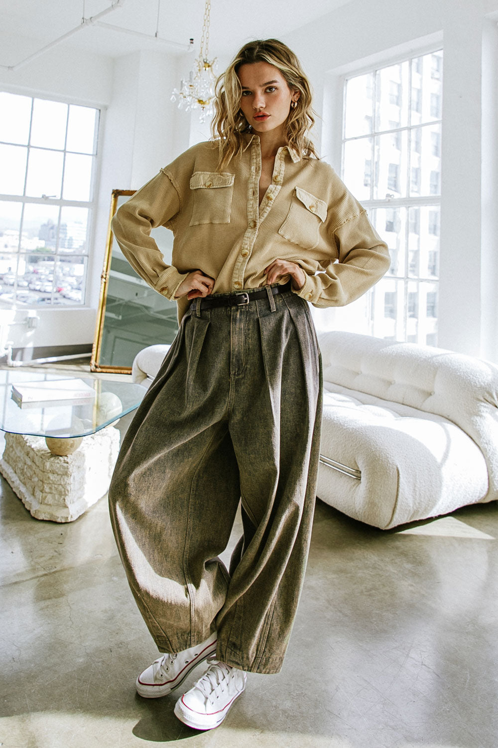 Enhance your wardrobe with our premium overdye denim pants, boasting a double pleated front closure, convenient side pockets, and a sophisticated taperd leg design. Complete the look with the added touch of back pockets for both functionality and style.