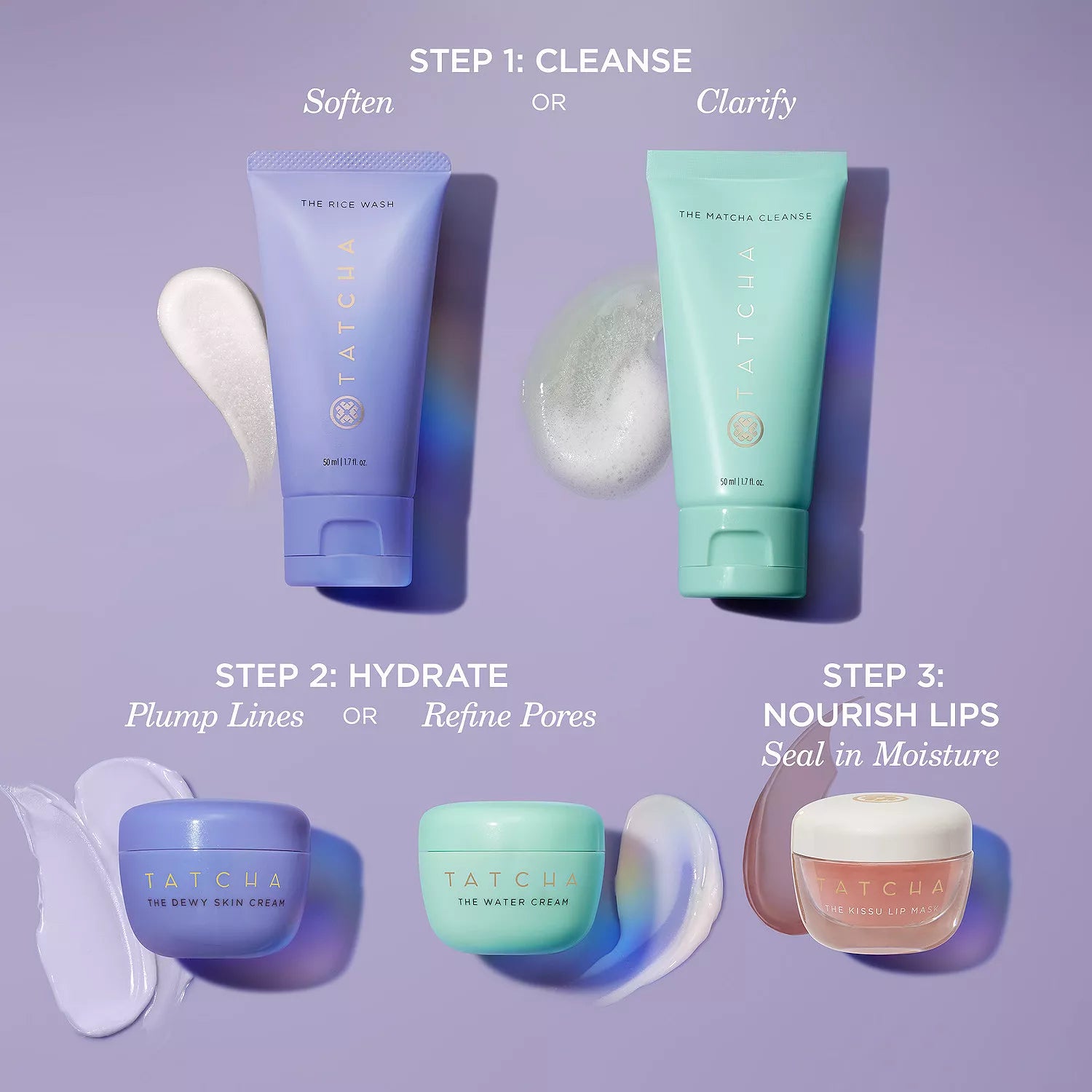 Each formula in this set works to visibly improve skin clarity, texture, and radiance. Choose between two cleansers — The Rice Wash or The Matcha Cleanse — and nourish with The Water Cream or The Dewy Skin Cream. For added indulgence, The Kissu Lip Mask comforts and softens lips overnight.