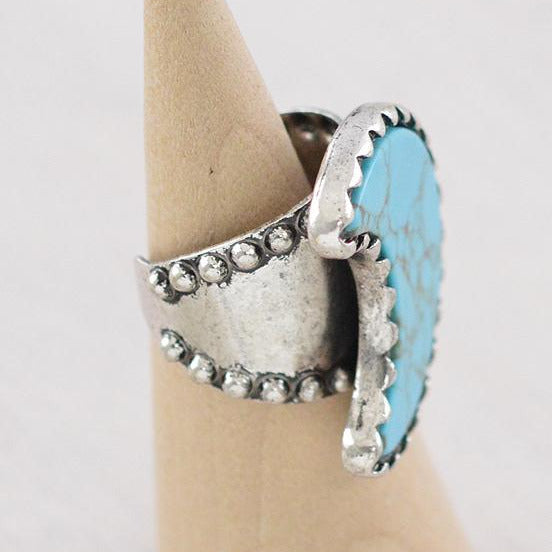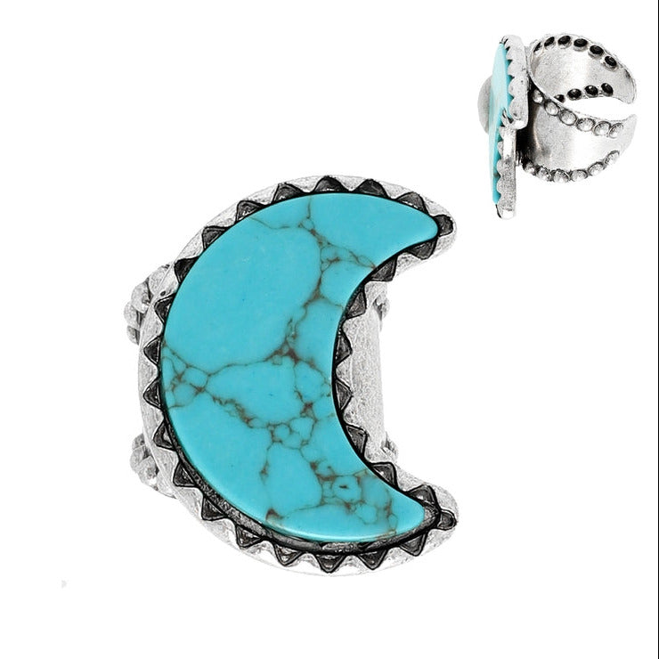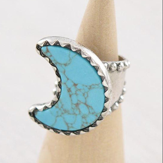 Pair this turquoise moon ring with layered silver cuffs or fringe accents for a bold western look, or wear it solo for a celestial statement that shines day or night.