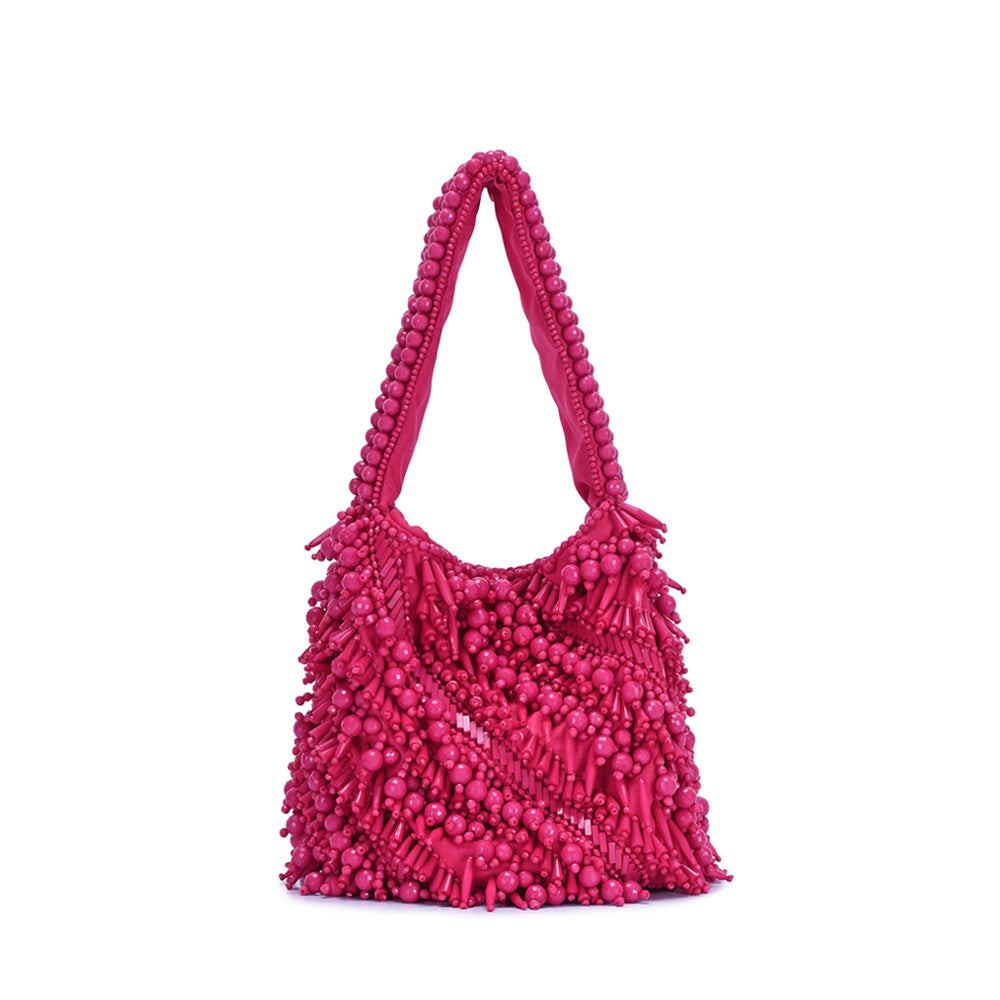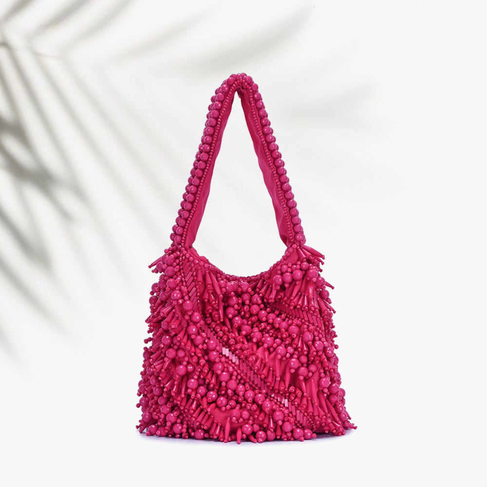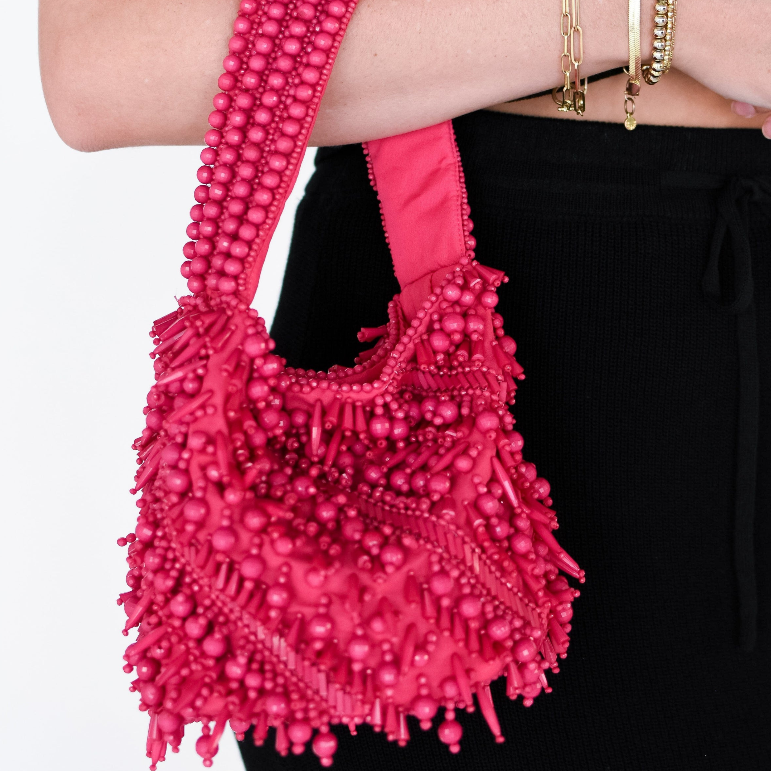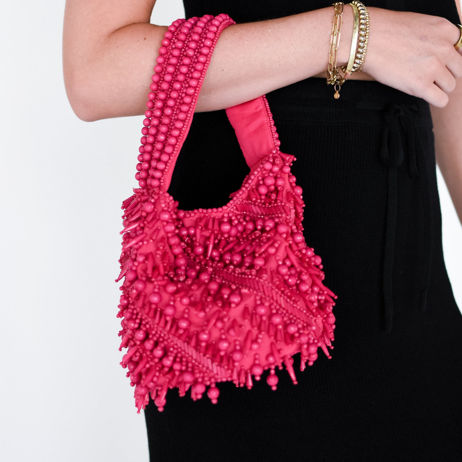 This sassy and fun vibrant pink handbag is embellished with vibrant beads in a striped, fringe-like design that will enhance any style outfit from Preppy to Boho!