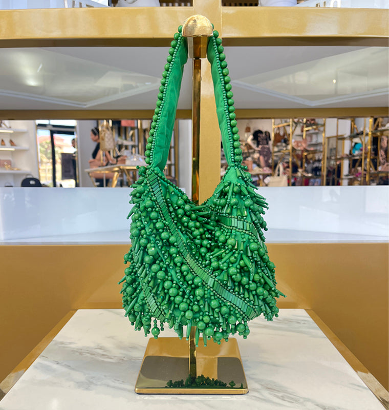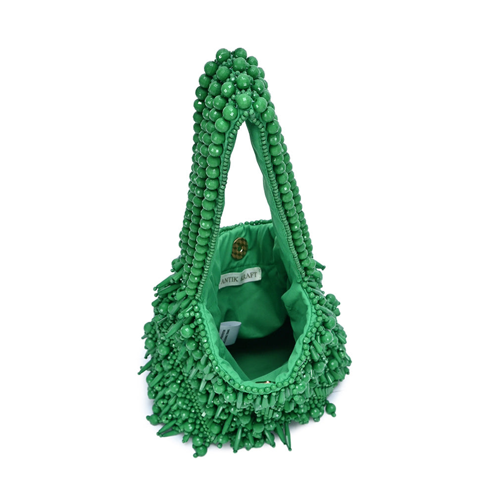 Crafted from 100% polyester and carefully applied beads, this bag is designed to last, providing a durable yet stylish option for those who appreciate quality and artistry.