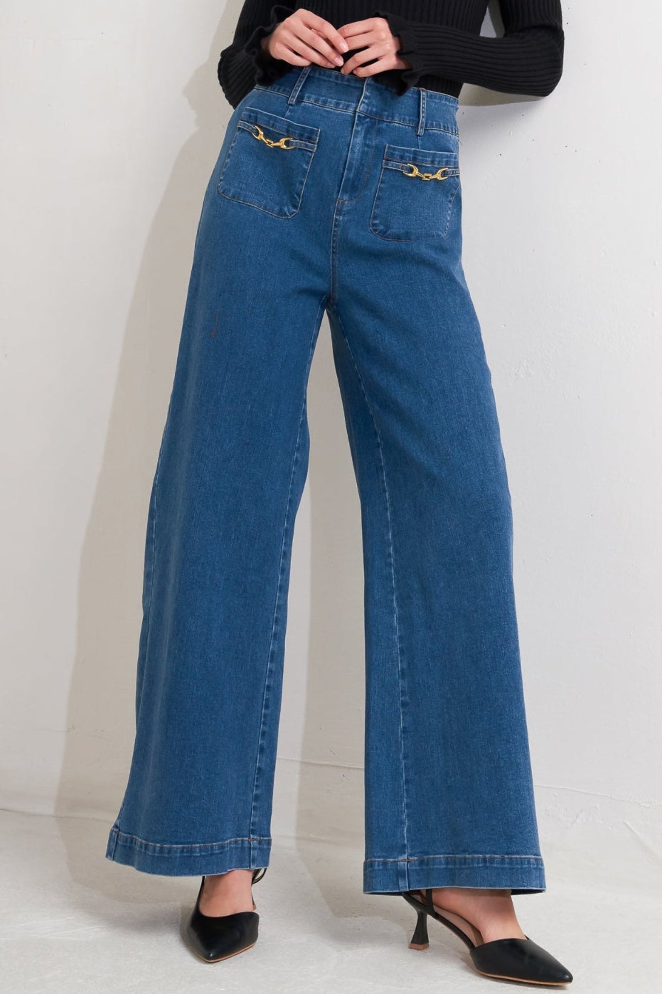 A washed denim pant featuring front zipper closure, side pocket and wide leg