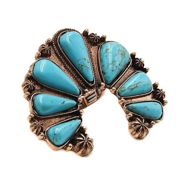 Make a bold western statement with the Turquoise Squash Blossom Ring. Inspired by the iconic Navajo squash blossom motif, this ring celebrates desert beauty and heritage style. Featuring brilliant turquoise stones on your choice of copper or silver electro-plated base, it’s designed with a comfortable stretch band that fits most sizes. A showstopping piece that brings timeless western artistry to any look.