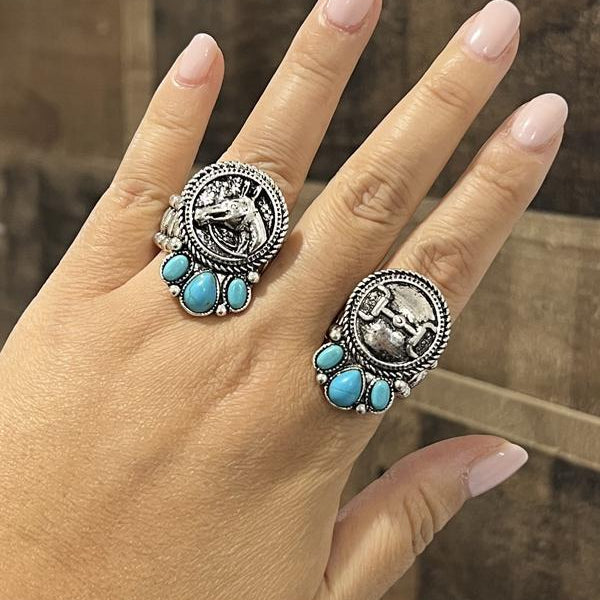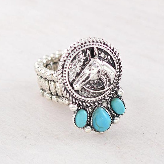 Ride into style with the Turquoise Trailblazer Ring—a western statement piece that captures the spirit of freedom and adventure. Featuring a detailed horse motif surrounded by a trio of turquoise stones, this stretch-band design blends rugged charm with effortless comfort. Perfect for rodeo weekends, festivals, or everyday cowgirl glam.