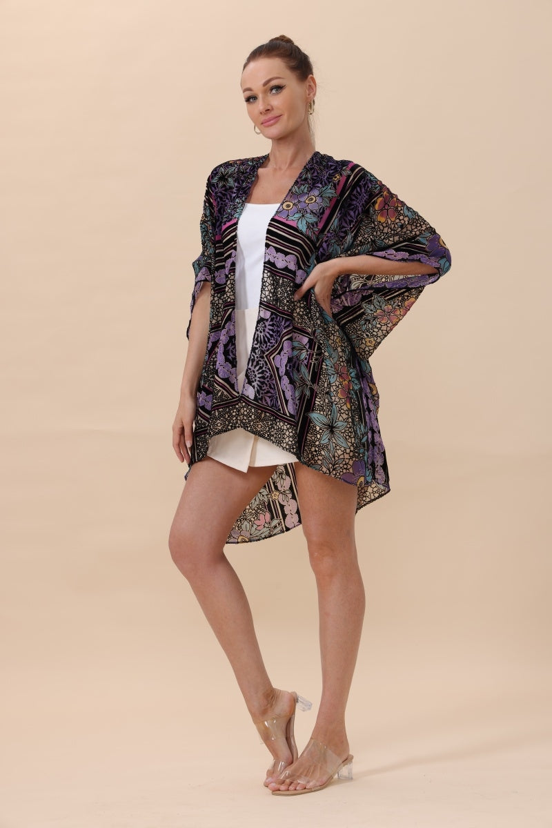 A luxurious kimono featuring a unique combination of velvet fabric and intricate flocked printing. The soft texture and elegant drape make it perfect for special occasions or elevated loungewear.
