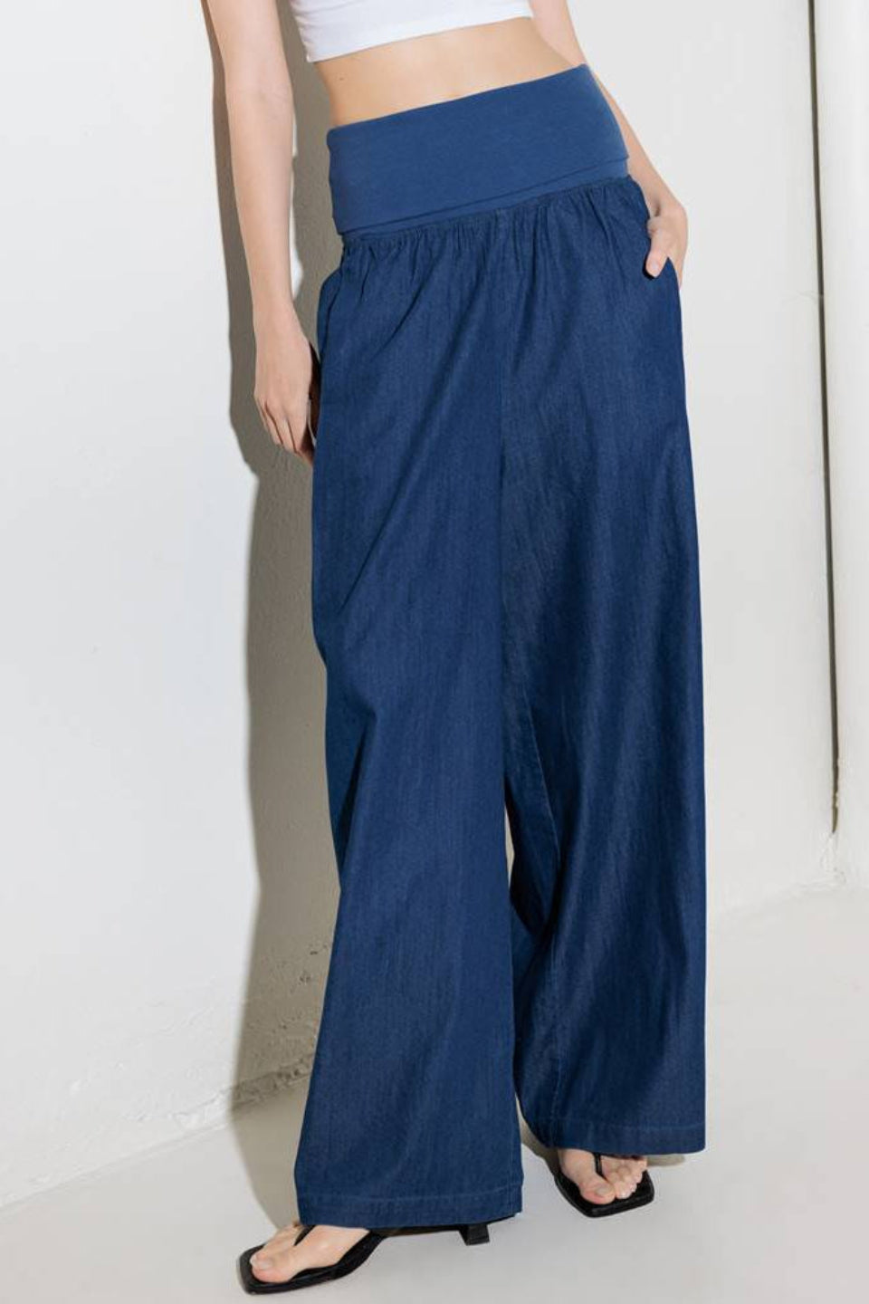 A chambray pant/jumpsuit 2fer with ribbed band and side pocket.