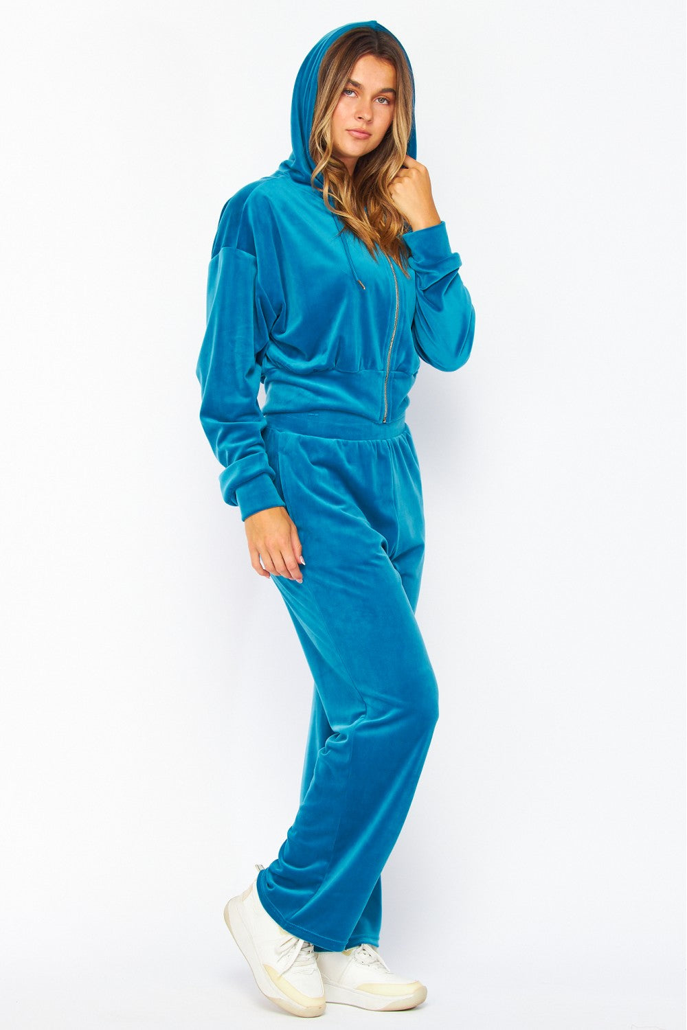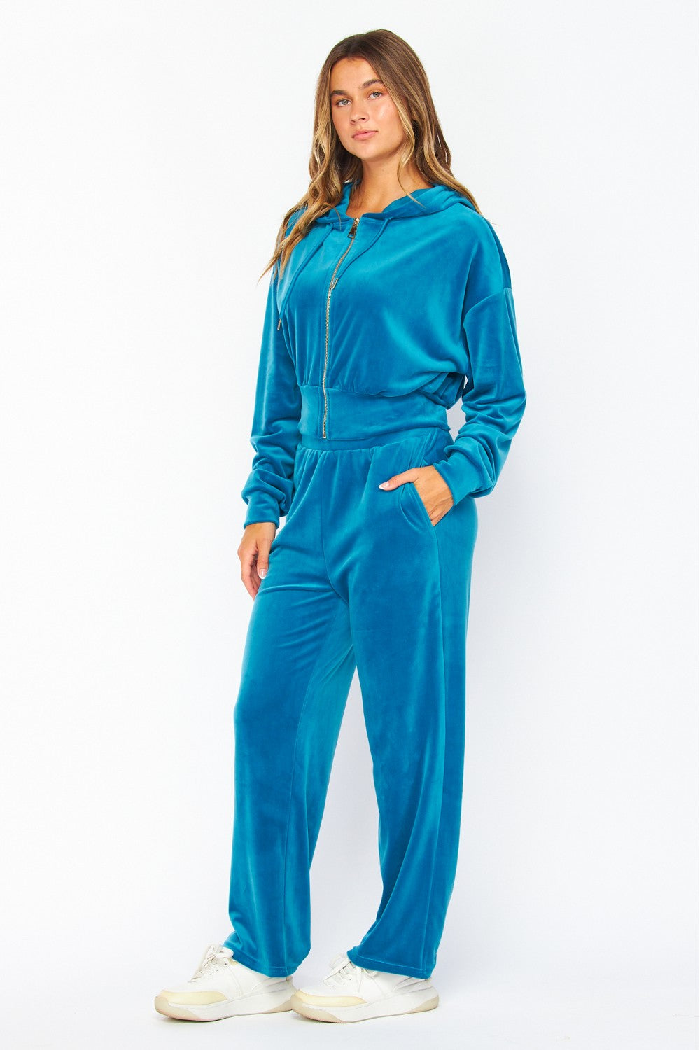 Live your off-duty life like itâs a soft-focus montage. This velour jogger set brings plush comfort wrapped in a sleek, gold-zipped finish. The zip-up hoodie drapes effortlessly in buttery-soft velour, while the matching straight-flare pant keeps everything elevated, loungey, and impossibly smooth. This is the set you wear when you want comfort without sacrificing the vibe. Classic. Luxe.Â