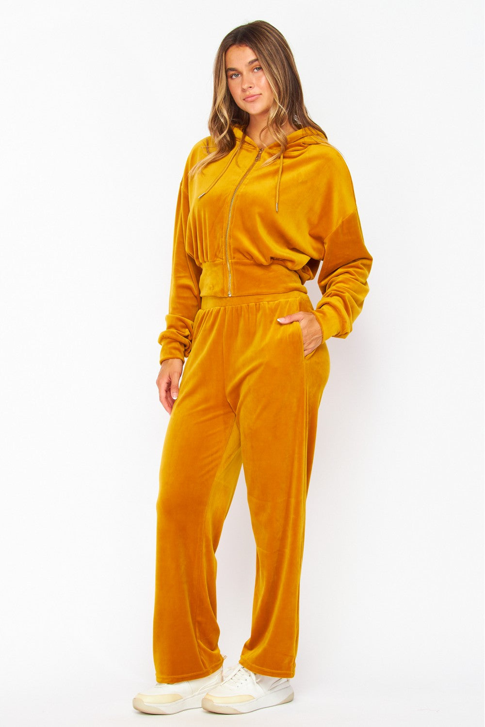 Live your off-duty life like it’s a soft-focus montage. This velour jogger set brings plush comfort wrapped in a sleek, gold-zipped finish. The zip-up hoodie drapes effortlessly in buttery-soft velour, while the matching straight-flare pant keeps everything elevated, loungey, and impossibly smooth. This is the set you wear when you want comfort without sacrificing the vibe. Classic. Luxe.