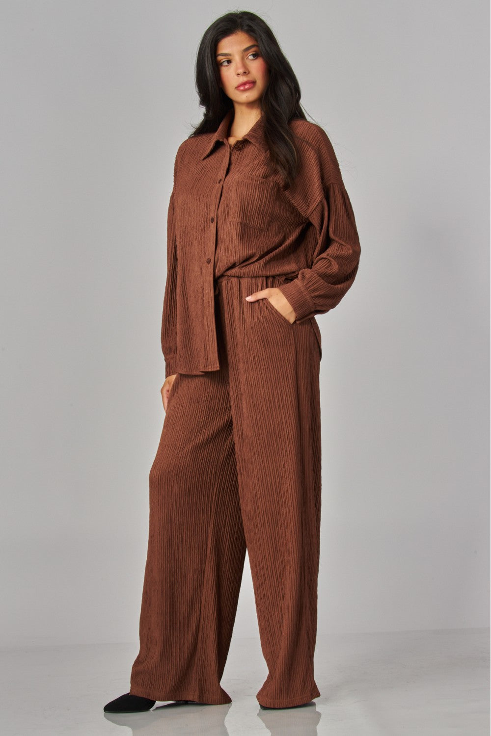A loungewear set that actually looks like you tried. The Welcome The Weekend Lounge Pants Set is crafted in finely pleated crinkled plissé, giving it a luxe sheen and an elegant drape. The button-down blouse falls effortlessly over the frame, while the matching wide-leg pants move with fluid softness. This is “sophisticated leisure” in its purest form: polished, comfortable, and ready to drift from brunch to relaxation without missing a beat.