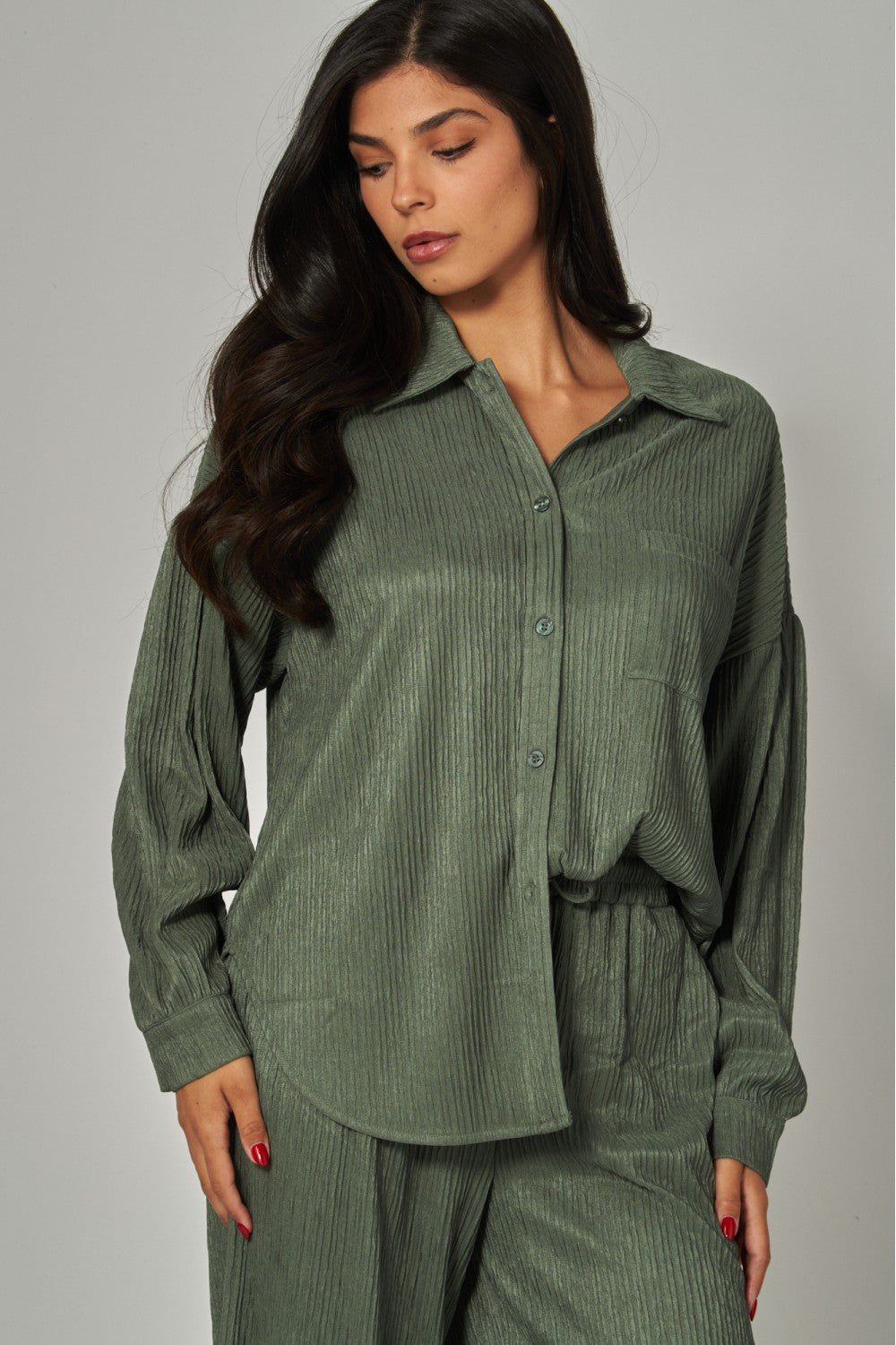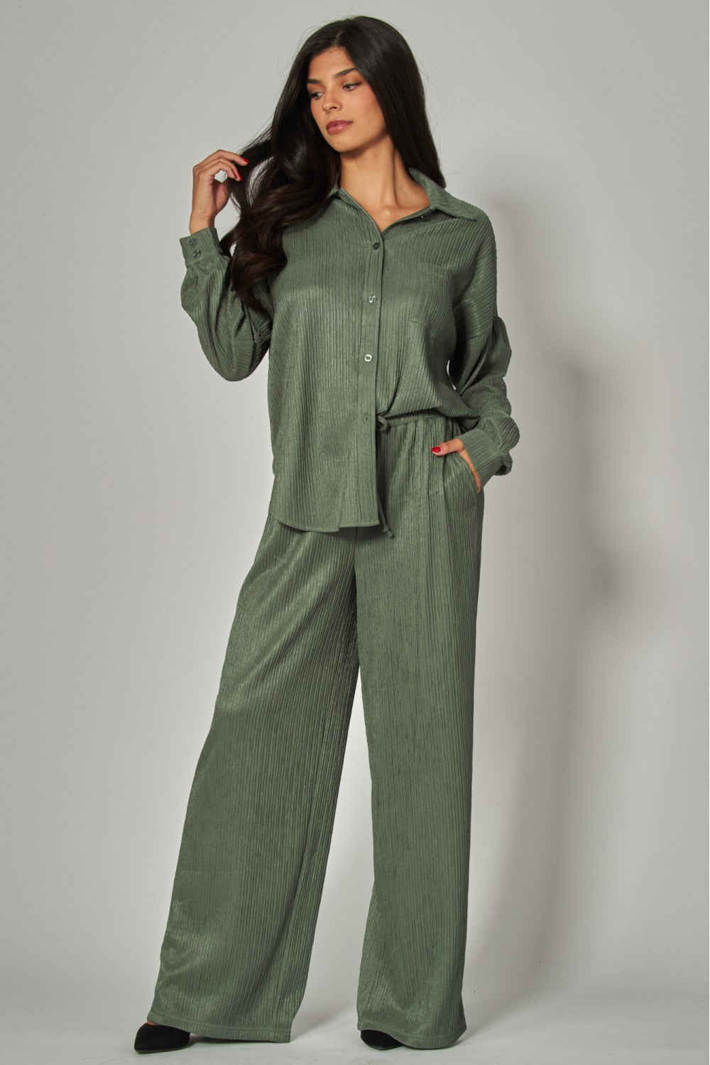 A loungewear set that actually looks like you tried. The Welcome The Weekend Lounge Pants Set is crafted in finely pleated crinkled plissé, giving it a luxe sheen and an elegant drape. The button-down blouse falls effortlessly over the frame, while the matching wide-leg pants move with fluid softness. This is “sophisticated leisure” in its purest form: polished, comfortable, and ready to drift from brunch to relaxation without missing a beat.