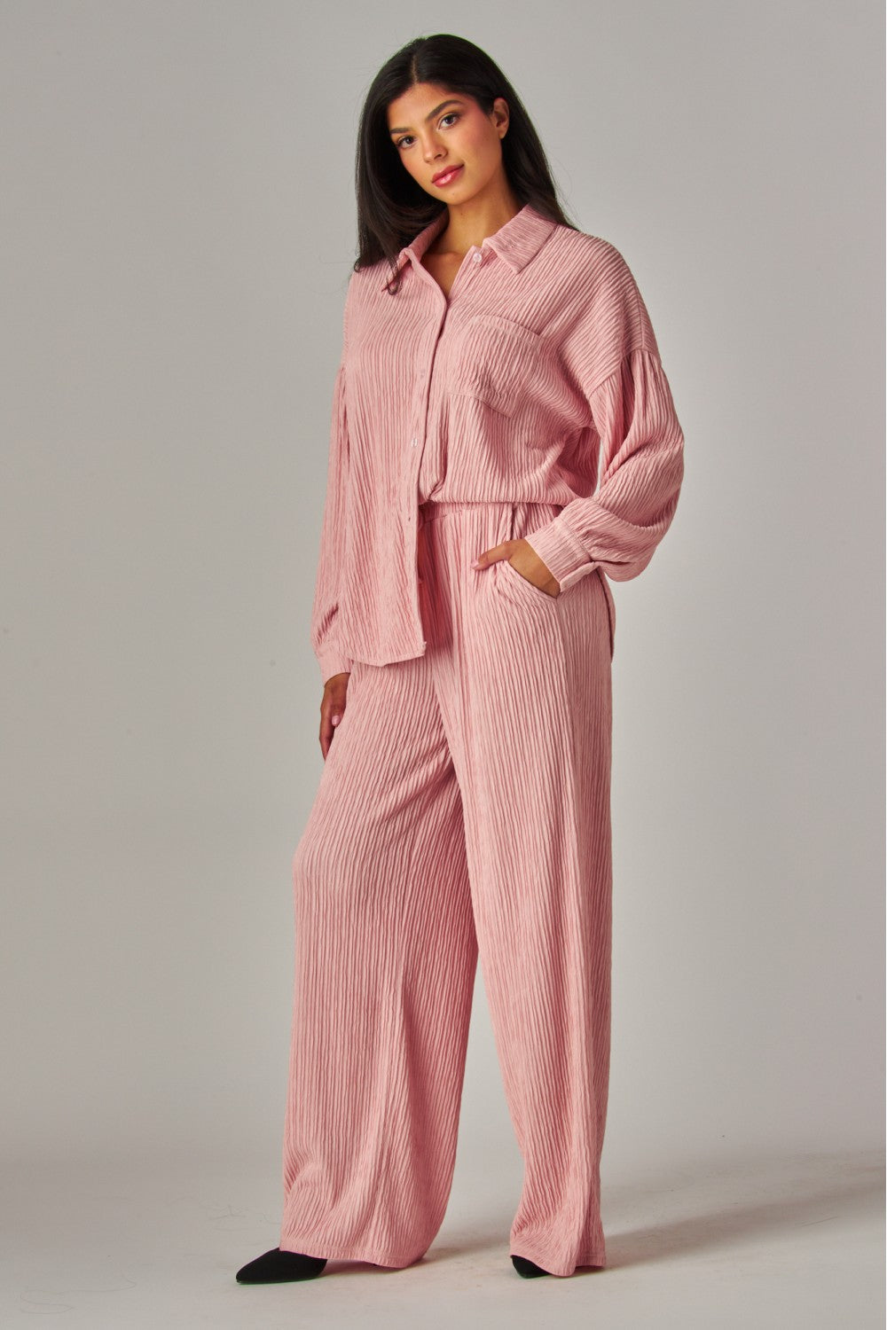 A loungewear set that actually looks like you tried. The Welcome The Weekend Lounge Pants Set is crafted in finely pleated crinkled plissé, giving it a luxe sheen and an elegant drape. The button-down blouse falls effortlessly over the frame, while the matching wide-leg pants move with fluid softness. This is “sophisticated leisure” in its purest form: polished, comfortable, and ready to drift from brunch to relaxation without missing a beat.