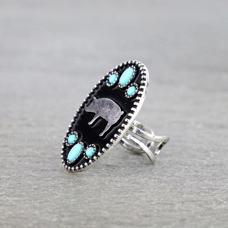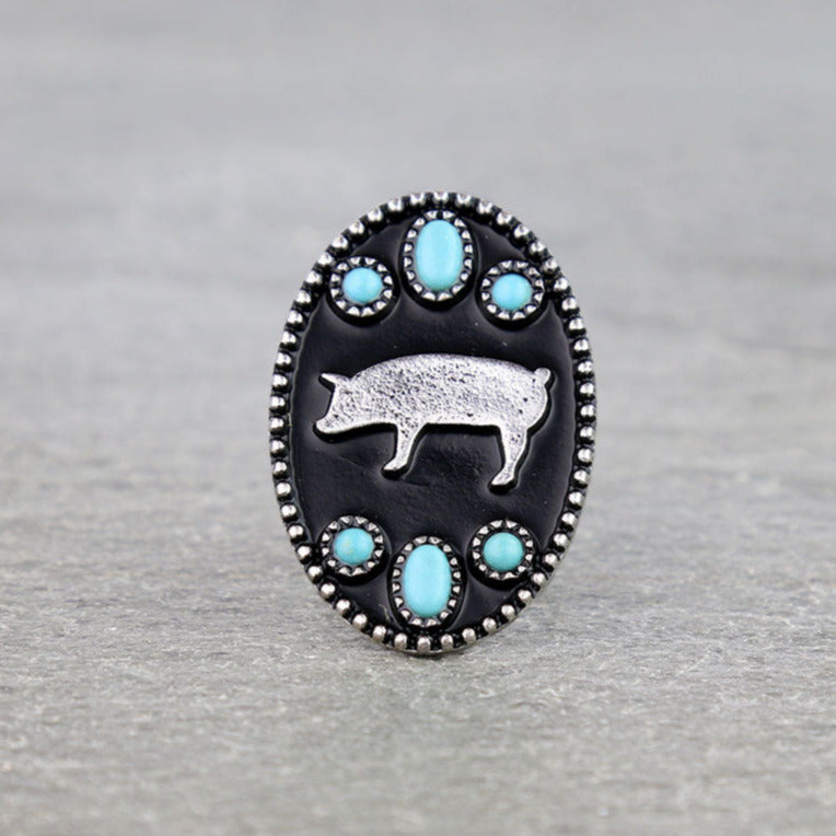 Add a touch of playful charm to your western-inspired look with the Western Style Silver Pig Ring. Crafted in a polished silver-plated finish, this adjustable cuff-back ring features a whimsical pig motif with turquoise stone accents that embodies rustic personality and individuality. Hypoallergenic and comfortable, it’s a unique accessory that blends humor, craftsmanship, and frontier style in one unforgettable piece.