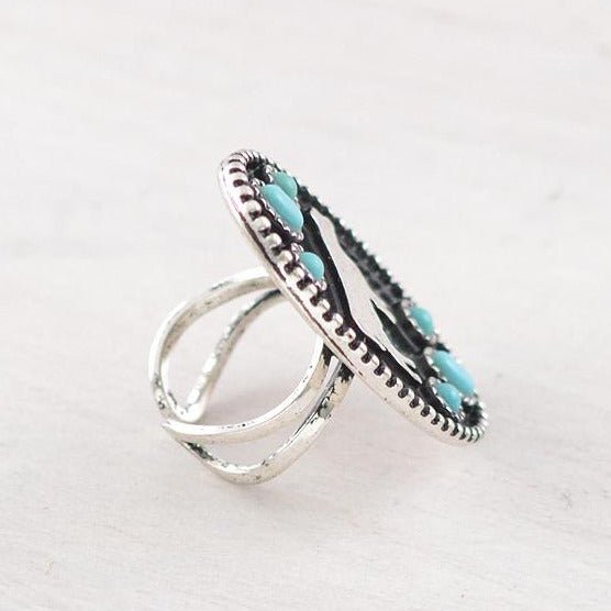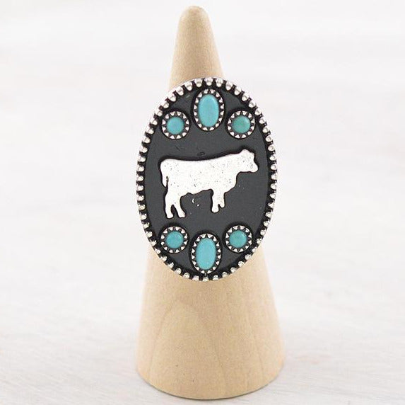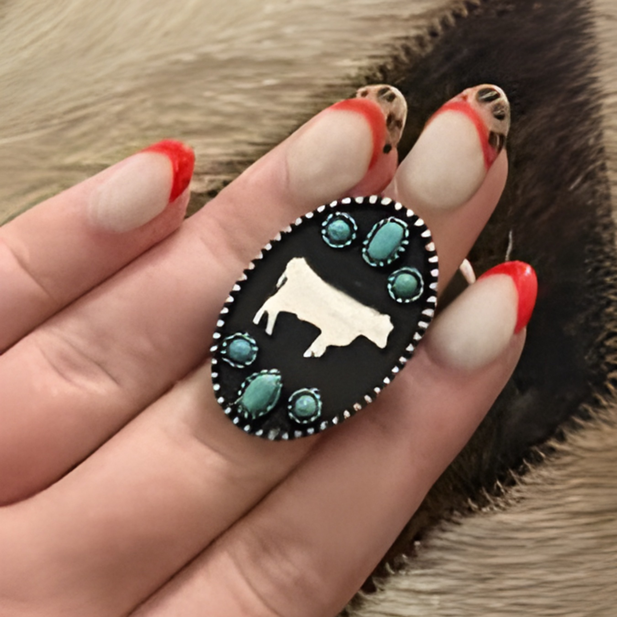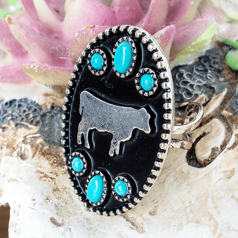 Channel rustic charm and cowgirl spirit with the Western Style Turquoise Silver Cow Ring. This adjustable cuff-back ring showcases a detailed cow motif accented with turquoise stones, embodying the essence of western design. Finished in polished silver plating, it’s a standout accessory that blends heritage craftsmanship with modern boho flair.