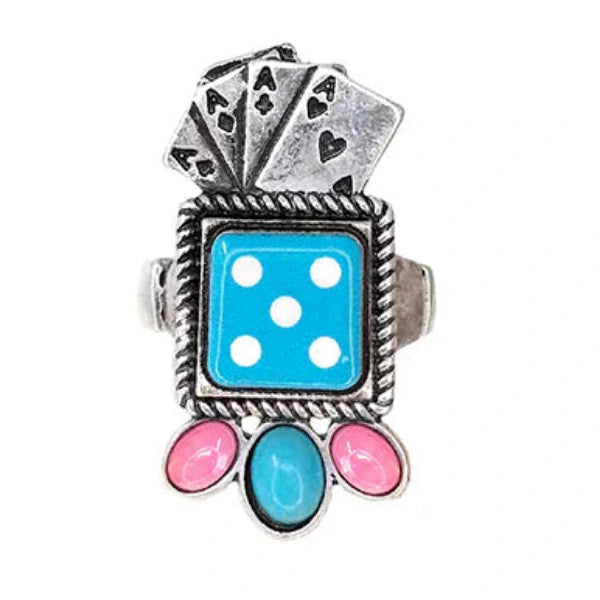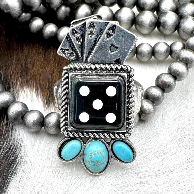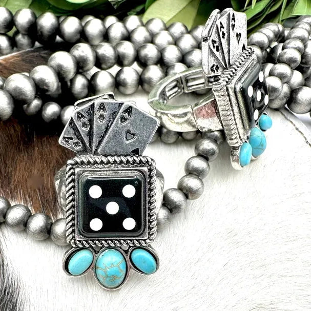 Stack the odds in your favor with the Winning Hand Silver Poker Ring. This bold silver statement ring features a hand of four aces, a lucky five-dotted die, and your choice of turquoise or pink mix stones for a playful pop of color. Designed with a stretch-back band, it’s the perfect blend of western attitude, casino glamour, and cowgirl confidence—because luck always favors the bold.